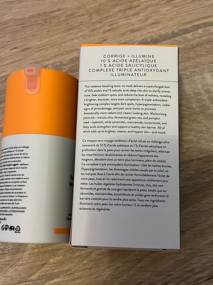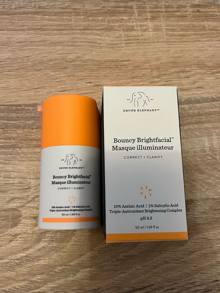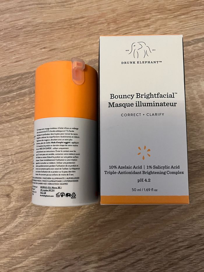 Neuf. Le masque visage sans rinçage Bouncy Brightfacial rehausse l’éclat de la peau grâce à une dose suractivée d’acide azélaïque (10 %) et d'acide salicylique (1 %), qui pénètrent en profondeur pour réduire les imperfections, améliorer les irrégularités du teint, estomper les taches rebelles sur la peau et minimiser les rougeurs. Le résultat : une peau éclatante, repulpée et unifiée. Les bénéfices de ce masque sans rinçage : L’acide azélaïque apaise la peau, tandis que l'acide salicylique lui offre un effet exfoliant. Les deux ingrédients agissent ensemble pour corriger les imperfections ainsi que les décolorations tout en améliorant le teint et le grain de la peau. Le complexe éclaircissant composé de trois antioxydants cible les taches brunes sur la peau, l’hyperpigmentation, les lésions dues au soleil et les marques causées par l’acné pour rendre votre peau plus lumineuse et plus éclatante. Les huiles végétales hydratantes comme l'huile de marula, chia, thé vert fermenté et graines de courge régénèrent la peau. Les céramides, le niacinamide, les tocotriénols et les acides gras renforcent la barrière cutanée. Le résultat : une peau plus claire, plus radieuse et plus heureuse, comme vous ! Naturality : Des produits formulés à partir d’ingrédients d’origine naturelle. Vegan : Des produits sans ingrédient d’origine animale.