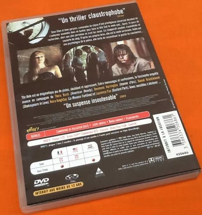 DVD The Hole Le week-end va être mortel (2002) Un film de Ben Court Avec Thora Birch, Desmond Harrington, Daniel Brocklebank, Laurence Fox, Embeth Davidtz Pathé Deux filles et deux garçons, camarades de classe d’une prestigieuse université, décident de s’enfermer ensemble dans un bunker pour faire la fête tout le week-end… Après 18 jours de recherches, alors que plus personne ne croit les revoir, Liz réapparaît soudain, traumatisée et couverte de sang. D’après ses propres dires, elle est la seule survivante. Aidée par une psychologue de la police, elle tente de reconstituer le puzzle du cauchemar…