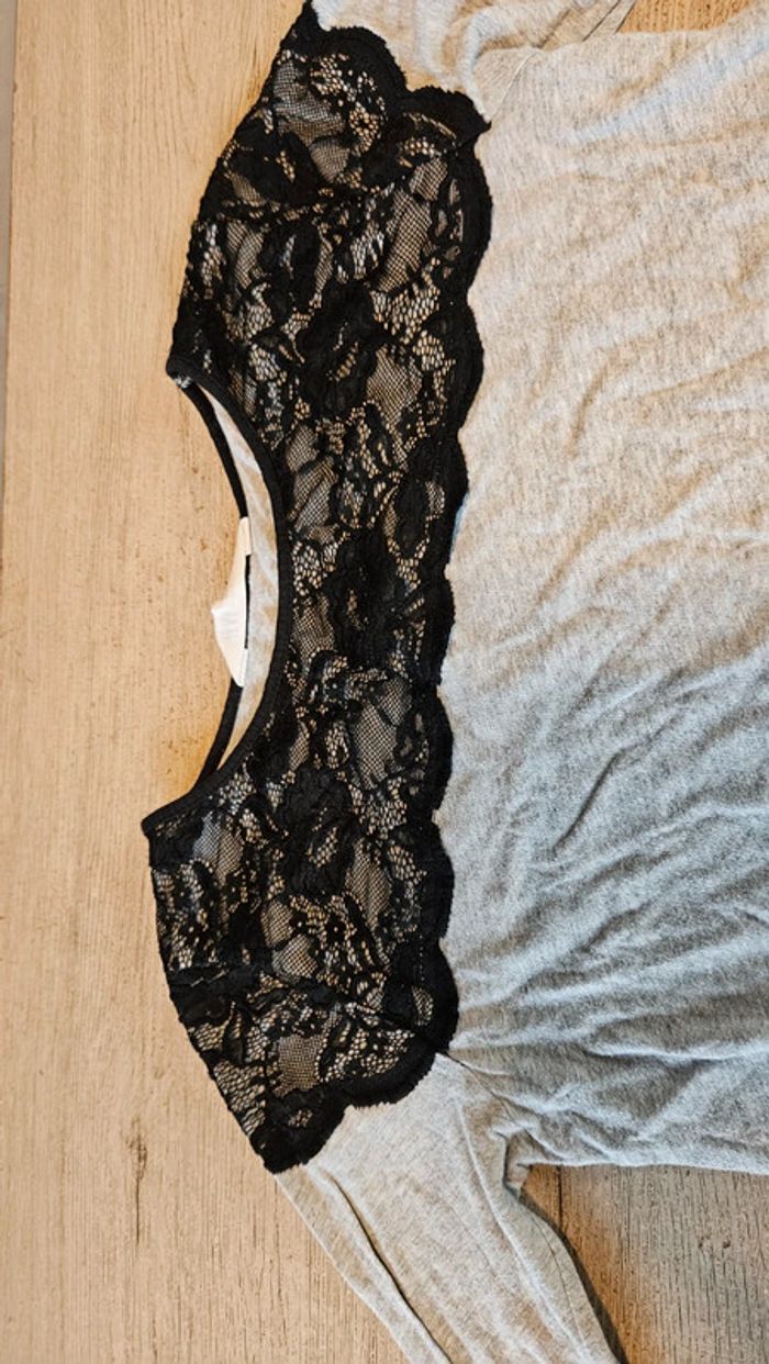 T shirt stretch gris clair avec le haut en dentelle noir. Col ronf. Très peu mis ma fille n aime pas. Convient pour du 14 à 16 ans ou du XS #deborahtock_14ans #deborahtock_16ans #deborahtock_femmeXS