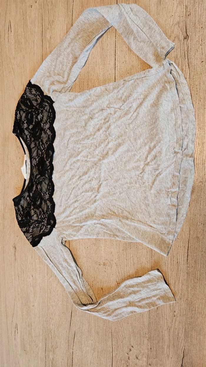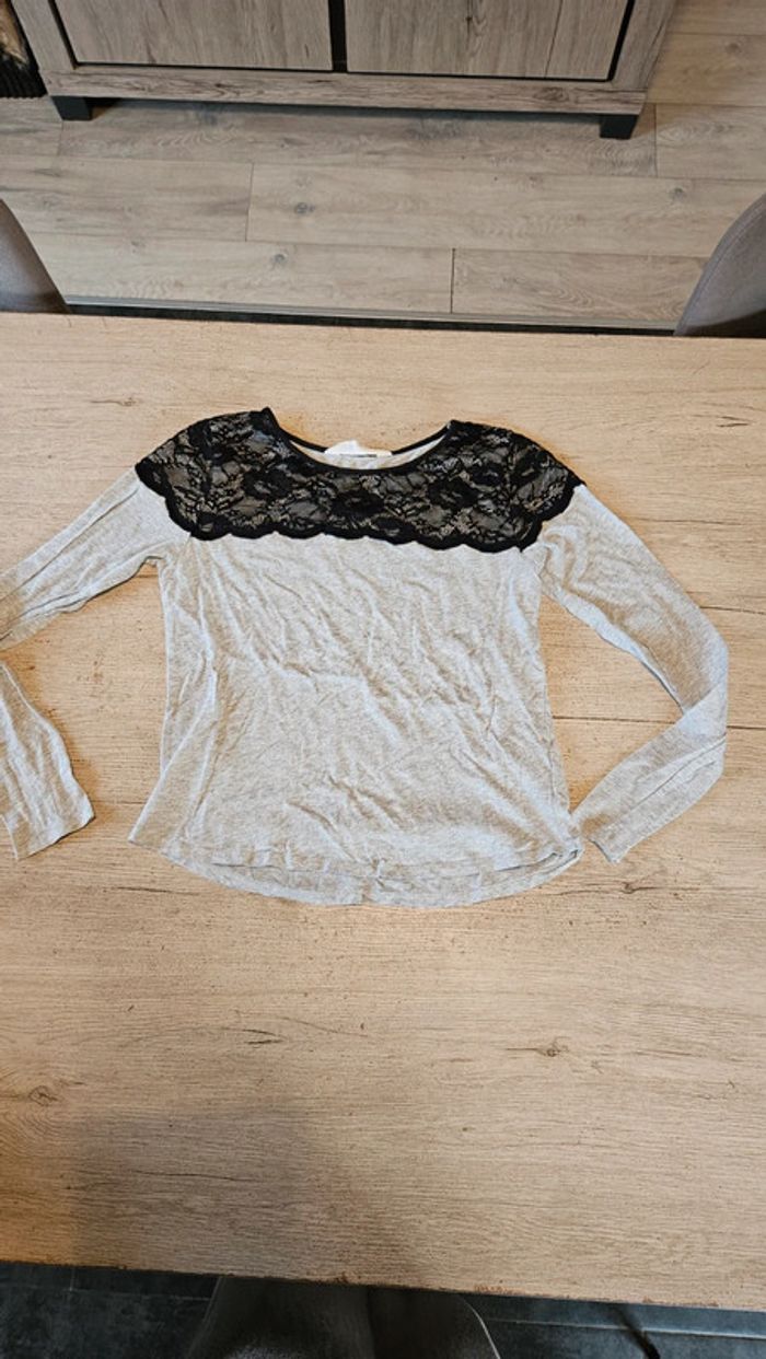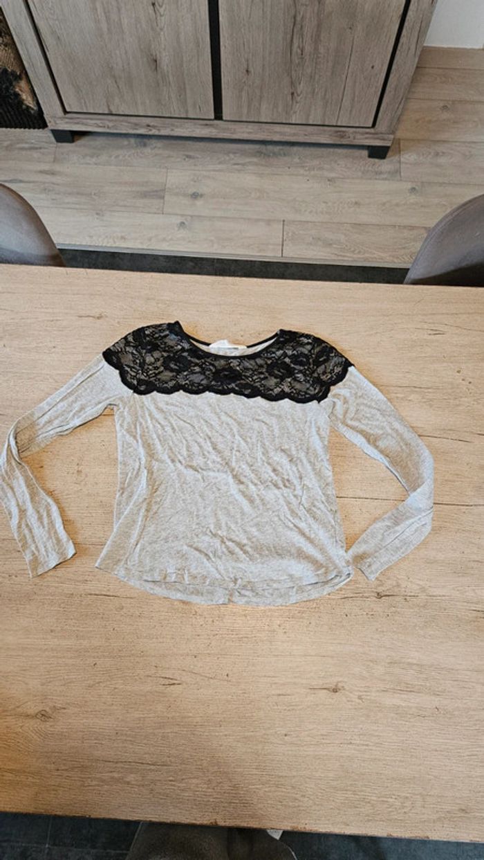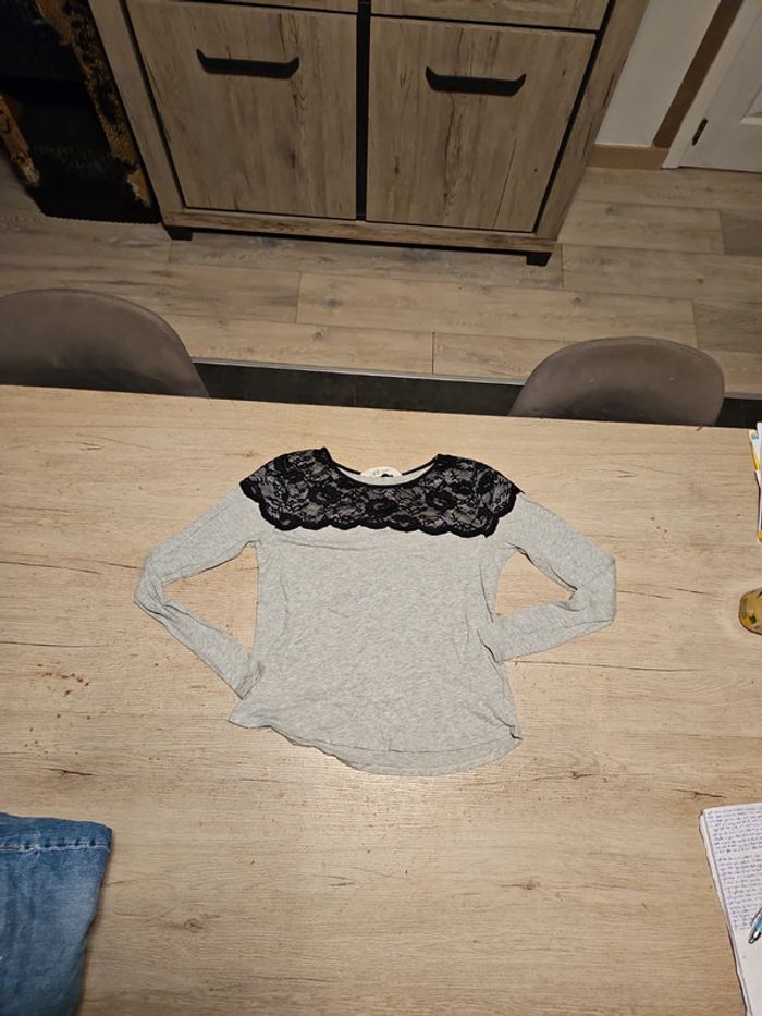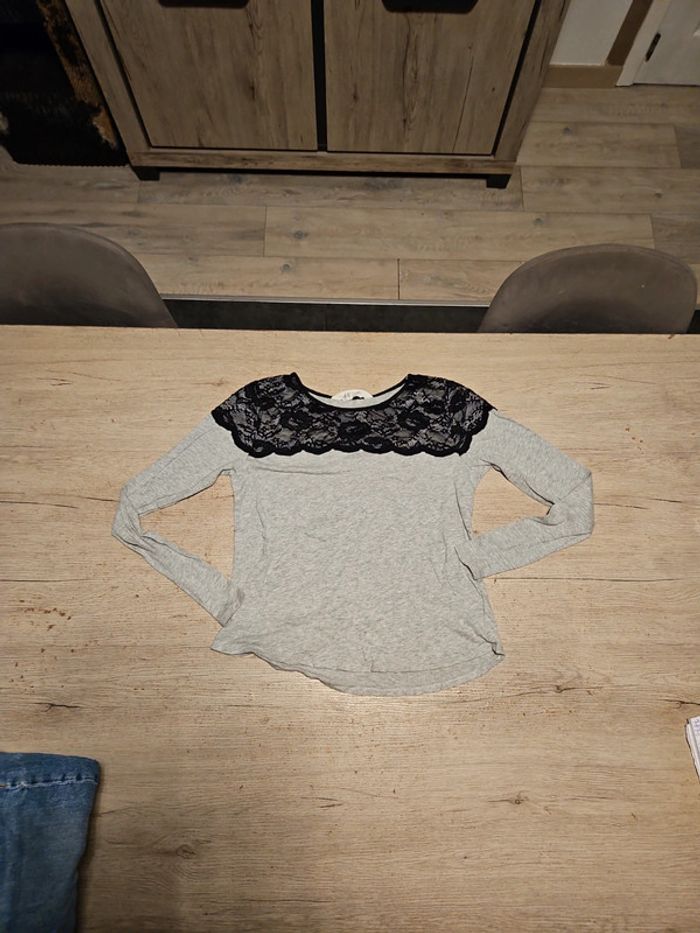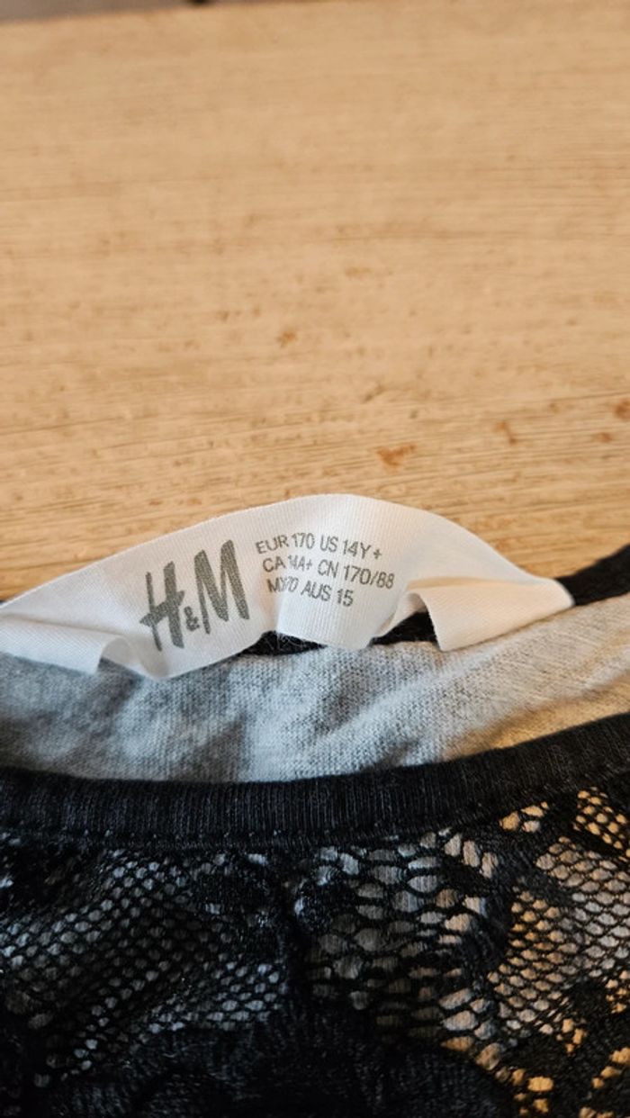 T shirt à manches longues gris clair, avec dentelle noire, H&M, taille 14/16 ans, peu mis - photo numéro 1