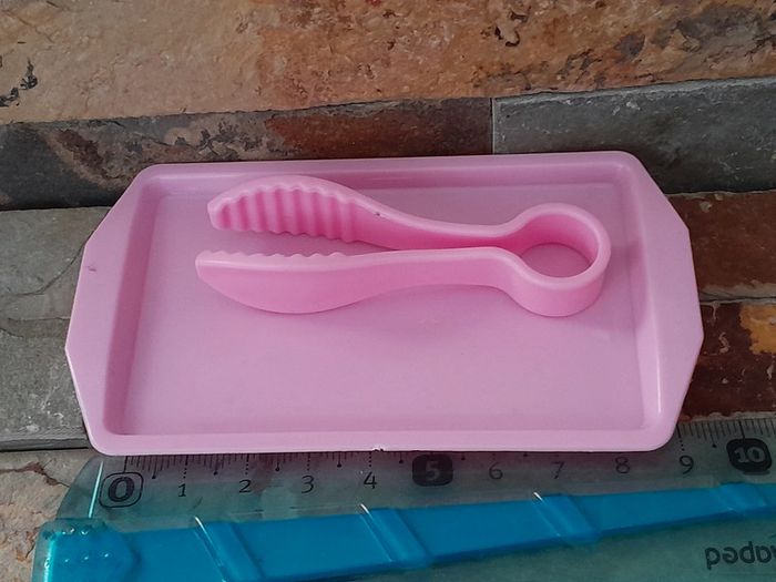 Petit plateau rose et sa pince . Accessoires pour dînette bon état. Vendus comme sur les photos. Consultez mes autres annonces, création de lot possible sur simple demande .🙂
