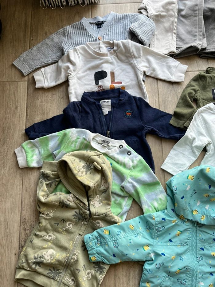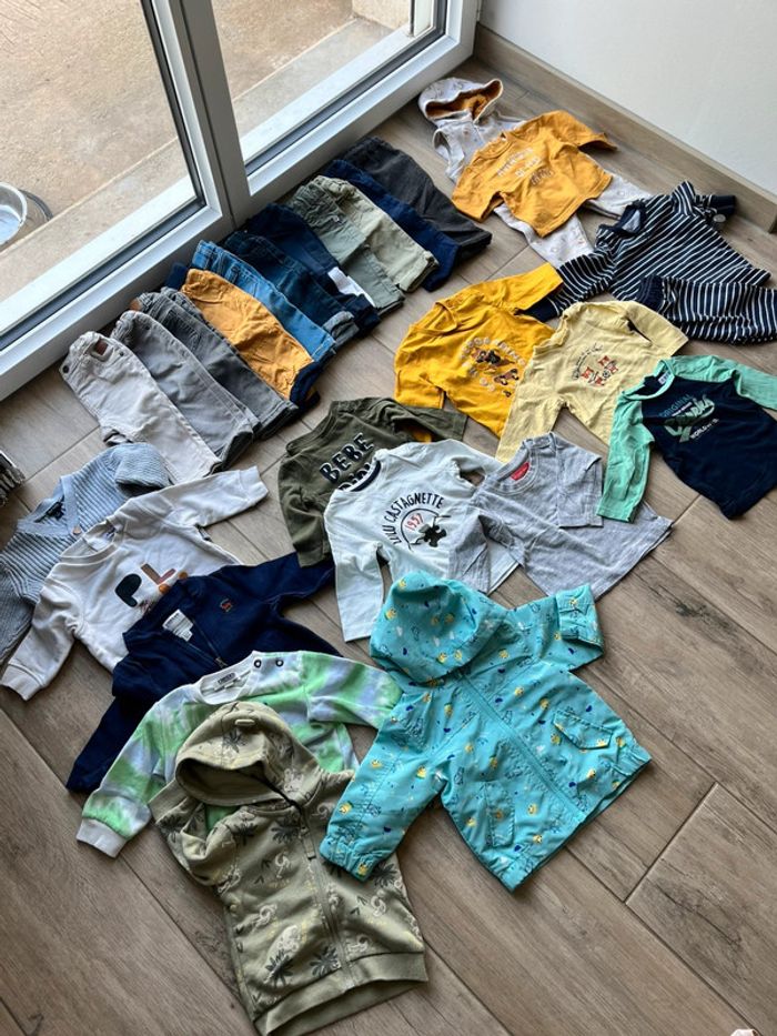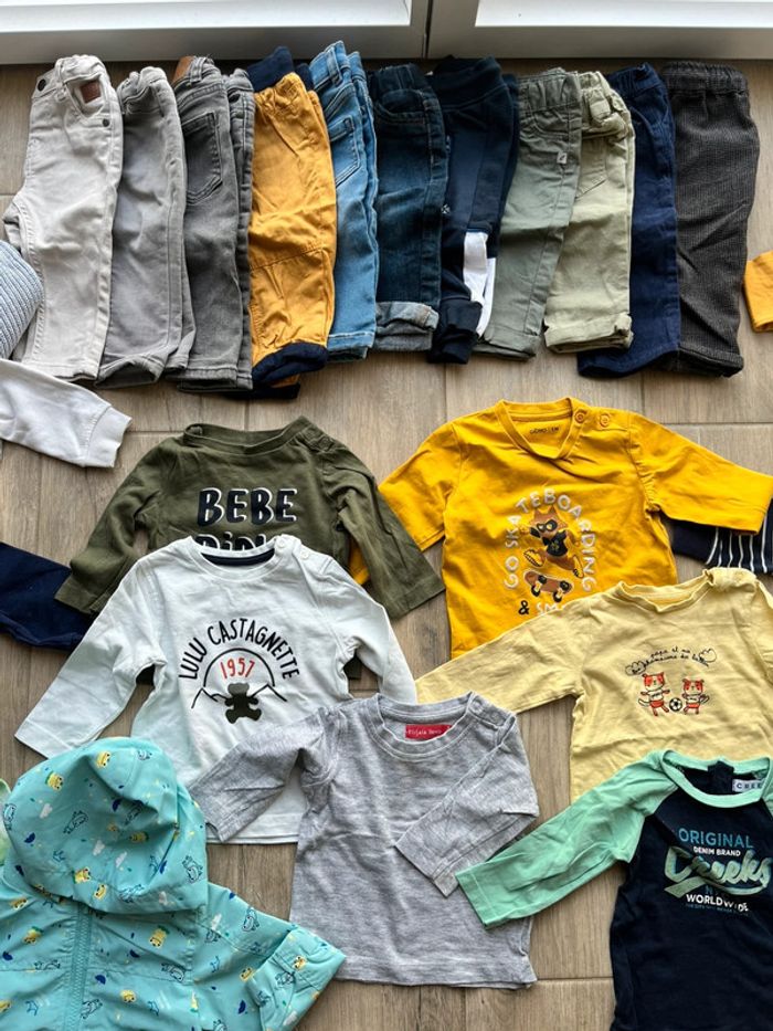 Lot vêtement garçon 6 mois automne hiver 11 pantalon 2 ensembles 6 tee shirt 5 pulls-gilets 1 manteau de pluie Tout est neuf Différentes marque Gémo creeks Kiabi Lulu castagnette