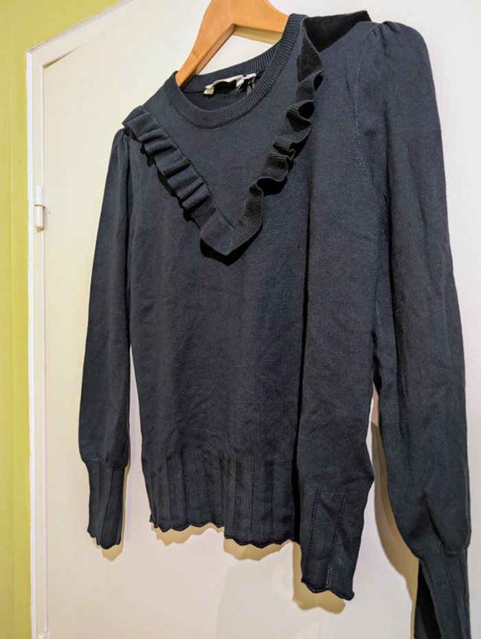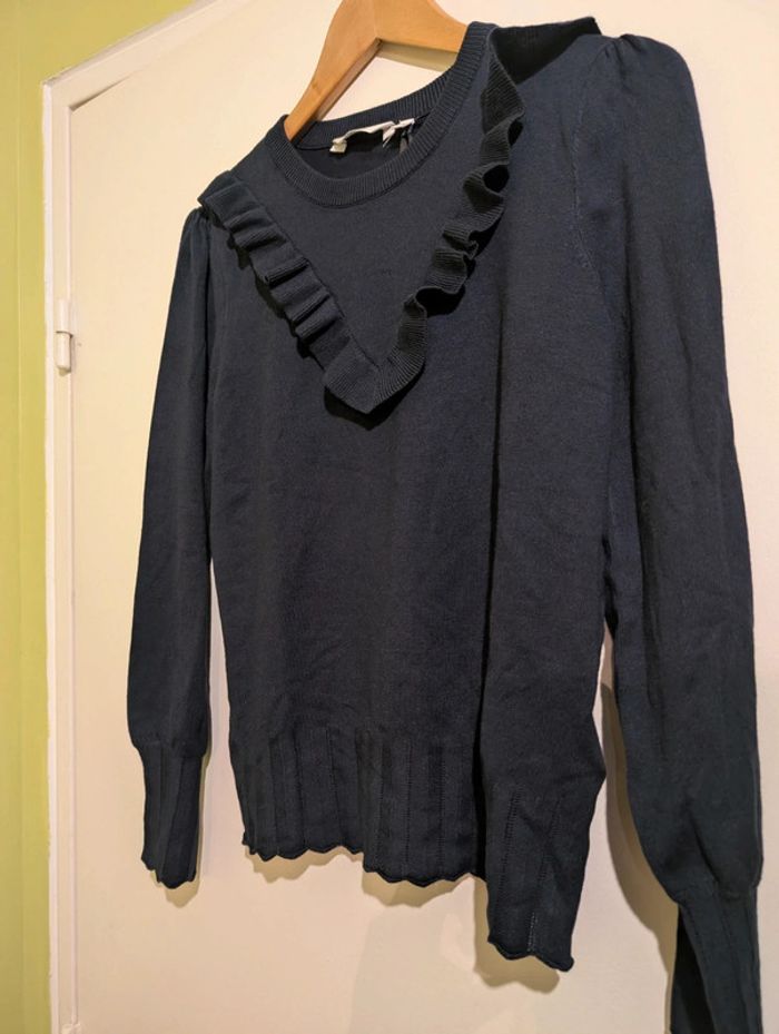 Pull original bleu marine Naf Naf taille M neuf Un design très féminin Détails fantaisie aux poignets et en bas de pull. Volant en forme de V. Tête de manches froncées Naf Naf, neuf avec étiquette Taille M Équivalent à 38/40 Acheté 40 euro #yipin_femme_m