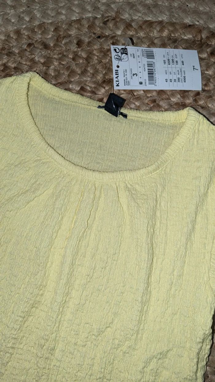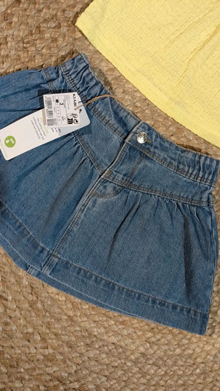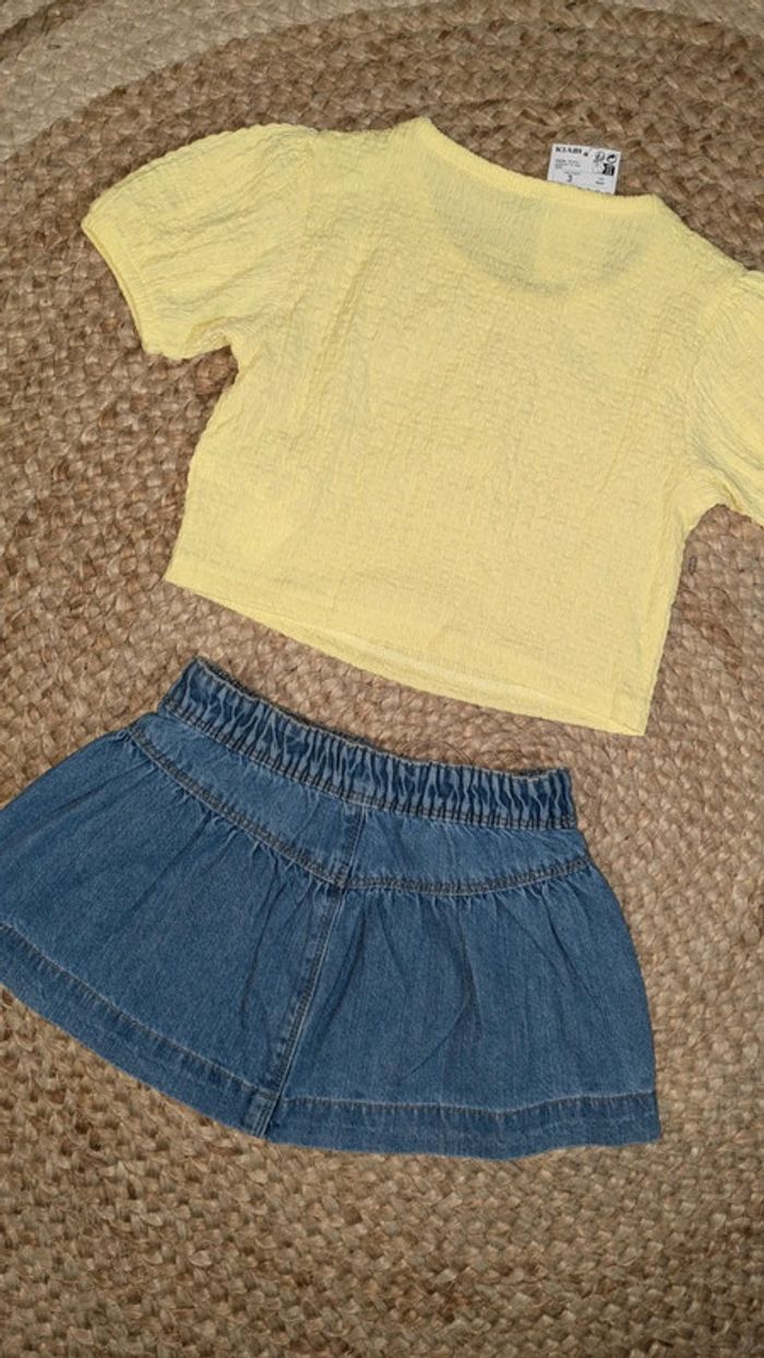 Joli ensemble été fille. Marque Kiabi. Taille 3 ans. Jupe en jean. Boutin pression. Haut court jaune. Les articles sont neufs avec étiquettes.