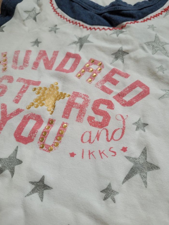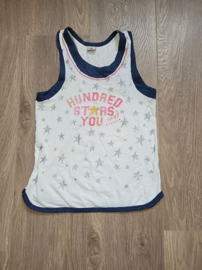 Débardeur blanc dos nageur. Motifs étoiles argentées. Marque IKKS. Taille 10 ans. N'hésitez pas à acheter en lot pour profiter des réductions