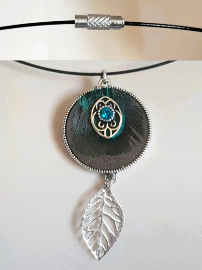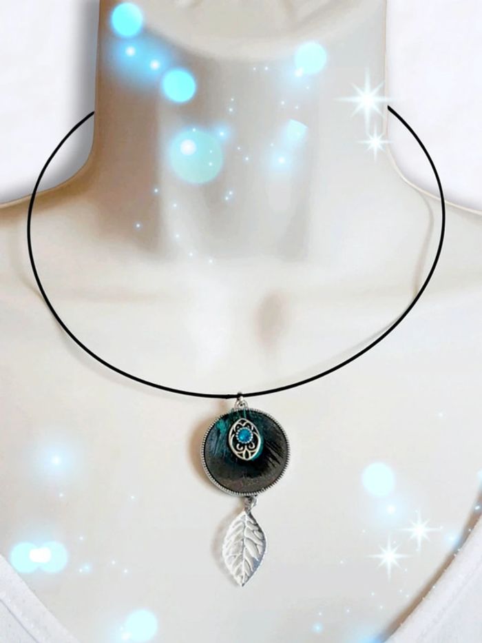 Collier ras de cou pendentif rond plume strass marron bleu argent  🇨🇵 Fabrication Artisanale - 45 cm - photo numéro 2