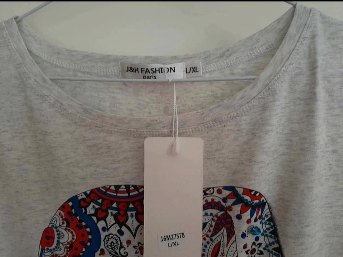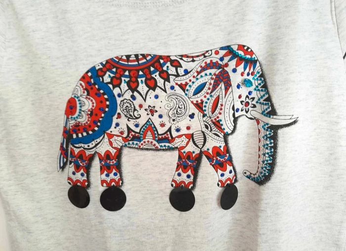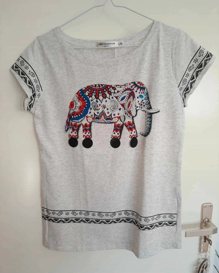 Magnifique t-shirt ethnique avec éléphant coloré et strass. Indiqué taille L/XL mais clairement plus petit, d'où le taille M. 95% coton. Neuf avec étiquette. Je le vends au prix de 12 euros. #TailleM38marine