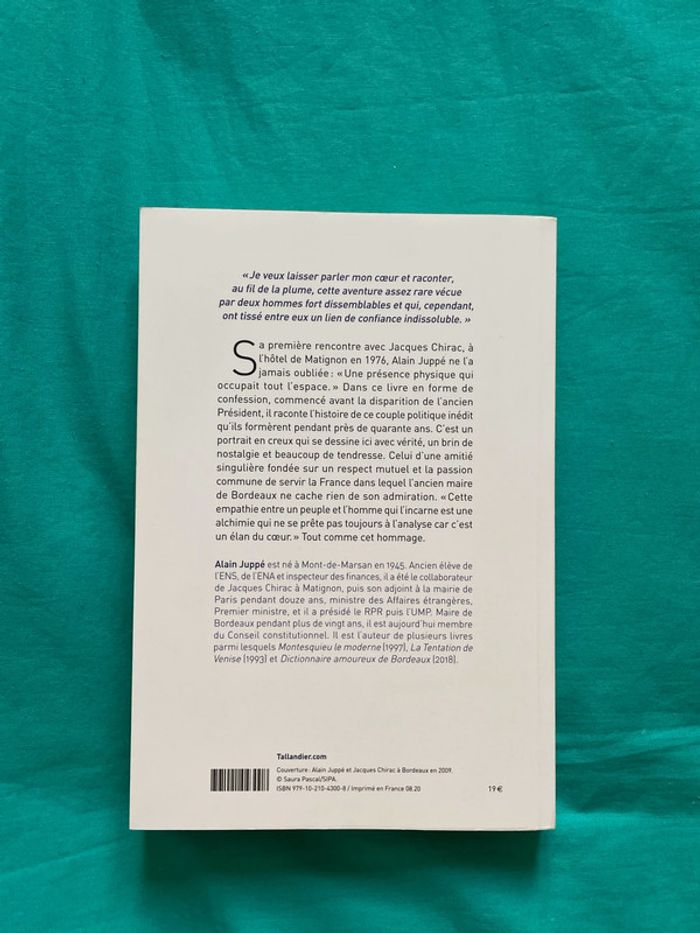 « Je veux laisser parler mon cœur et raconter, au fil de la plume, cette aventure assez rare vécue par deux hommes fort dissemblables et qui, cependant, ont tissé entre eux un lien de confiance indissoluble. » Sa première rencontre avec Jacques Chirac, à l’hôtel de Matignon en 1976, Alain Juppé ne l’a jamais oubliée : « Une présence physique qui occupait tout l’espace. » Dans ce livre en forme de confession, commencé avant la disparition de l’ancien Président, il raconte l’histoire de ce couple politique inédit qu’ils formèrent pendant près de quarante ans. C’est un portrait en creux qui se dessine ici avec vérité, un brin de nostalgie et beaucoup de tendresse. Celui d’une amitié singulière fondée sur un respect mutuel et la passion commune de servir la France dans lequel l’ancien maire de Bordeaux ne cache rien de son admiration. « Cette empathie entre un peuple et l’homme qui l’incarne est une alchimie qui ne se prête pas toujours à l’analyse car c’est un élan du cœur. » Tout comme cet hommage.
