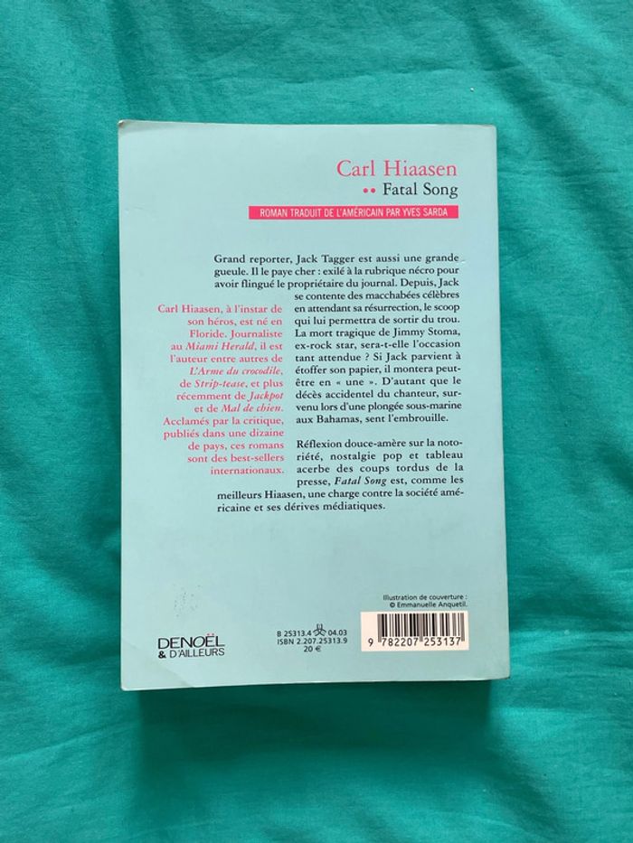 Grand reporter, jack tagger est aussi une grande gueule. Il le paye cher : exilé à la rubrique nécro pour avoir flingué le propriétaire du journal. depuis, jack se contente des macchabées célèbres en attendant sa résurrection, le scoop qui lui permettra de sortir du trou. la mort tragique de jimmy stoma, ex-rock star, sera-t-elle l'occasion tant attendue ? si jack parvient à étoffer son papier, il montera peut-être en " une ". d'autant que le décès accidentel du chanteur, survenu lors d'une plongée sous-marine aux bahamas, sent l'embrouille. Réflexion douce-amère sur la notoriété, nostalgie pop et tableau acerbe des coups tordus de la presse, fatal song est, comme les meilleurs hiaasen, une charge contre la société américaine et ses dérives médiatiques.