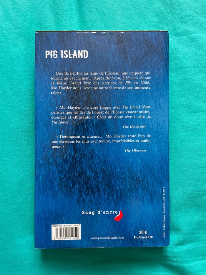 Une île perdue au large de l'Ecosse, une créature maléfique, une enquête qui tourne au cauchemar... Après l'inoubliable Tokyo, grand prix des lectrices de Elle en 2006, Mo Hayder nous livre une autre facette de son immense talent. Joe Oakes est journaliste et gagne sa vie en démystifiant les prétendus phénomènes paranormaux. Ce sceptique-né n'a jamais eu qu'un seul credo : tout s'explique rationnellement. En débarquant sur Pig Island, un îlot perdu au large de l'Ecosse, il est fermement décidé à vérifier si la trentaine d'allumés qui y vivent en vase clos vénèrent le diable comme les en accusent les gens de la côte. Et, surtout, il veut tordre le cou au mythe du monstre de Pig Island - une mystérieuse créature filmée deux ans plus tôt sur le littoral désert de l'île par un touriste à moitié ivre. Mais rien, strictement rien ne se passe comme prévu. Joe Oakes va être confronté à des événements tels que son idée de la peur et du mal ne sera plus jamais la même...