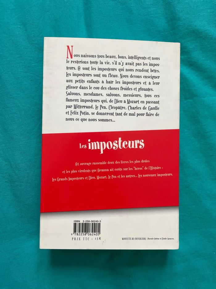 Vous naissons tous beaux, bons, intelligents et nous le resterions toute la vie, s'il n'y avait pas les imposteurs. Ce sont les imposteurs qui nous rendent bêtes. Les imposteurs sont un fléau. Nous devons enseigner aux petits enfants à haïr les imposteurs et à leur glisser dans le cou des choses froides et gluantes. Saluons, mesdames, saluons, messieurs, tous ces fameux imposteurs qui, de Dieu à Mozart en passant par Mitterrand, Le Pen, Cléopâtre, Charles de Gaulle et Félix Potin, se donnèrent tant de mal pour faire de nous ce que nous sommes... Les Imposteurs. Cet ouvrage rassemble deux des livres les plus des livres les plus drôles et les plus virulents que Cavanna ait écrits sur les héros de l'Histoire : Les grands Imposteurs et Dieu, Mozart, Le Pen et les autres... Les nouveaux imposteurs.