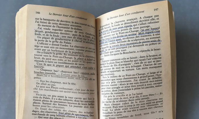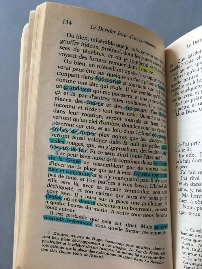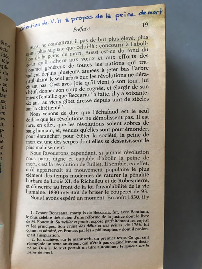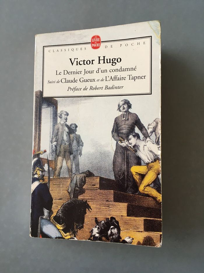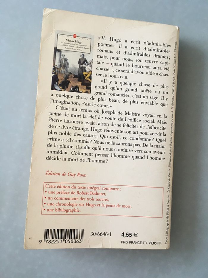 « V. Hugo a écrit d’admirables poèmes, il a écrit d’admirables romans et d’admirables drames ; mais, pour nous, son œuvre capitale - quand le bourreau aura été chassé -, ce sera d’avoir aidé à chasser le bourreau. « Il y a quelque chose de plus grand qu’un grand poète ou un grand romancier, c’est un sage. Il y a quelque chose de plus beau, de plus enviable que l’imagination, c’est le cœur. « C’était au temps où Joseph de Maistre voyait en la peine de mort la clef de voûte de l’édifice social. Mais Pierre Larousse avait raison de se féliciter de l’efficacité de ce livre étrange. Hugo réinvente son art pour servir la plus noble des causes. Qui est-il, ce condamné ? Quel crime a-t-il commis ? Nous ne le saurons pas. De la main, de la plume, il suffit qu’il nous conduise vers son avenir immédiat. Comment penser l’homme quand l’homme décide de la mort de l’homme ? Édition de Guy Rosa. Les pages commeçent à jaunir. La 1ère de couverture présente des pliures, la tranche une pliure et le haut de celle-ci s’est un peu décollé. Le Dernier Jour d’un Condamné contient du surligneur sur certaines pages, des notes, des traces d’effaceur et du soulignage. Les premières pages sont un peu gondolées sur le coin droit.