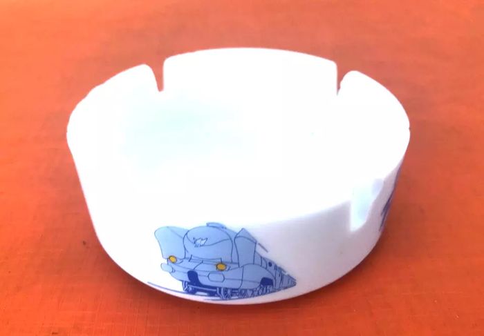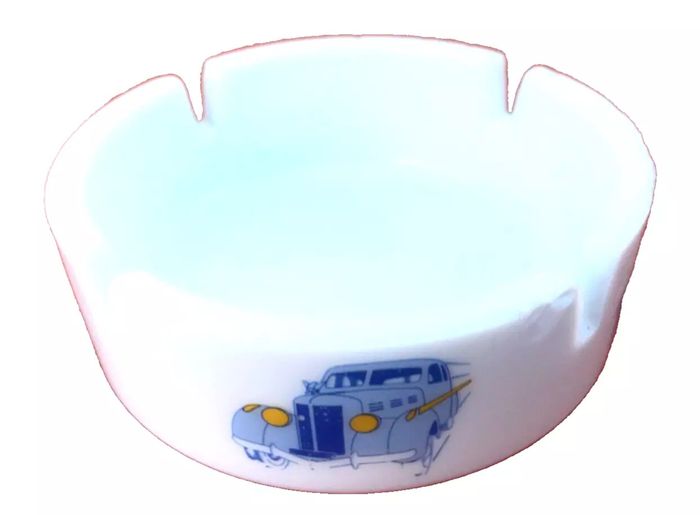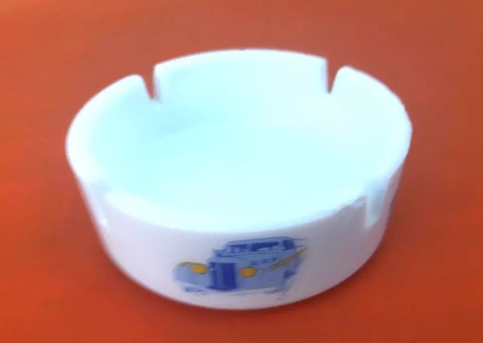escription (article vendu en l' état, état d' usage, nous précisons égrenures (photo 5 et 6) qui n' empêchent pas l' utilisation de cet article, voir toutes les photos) Cendrier publicitaire Gauloises Blue Way Verre opalin Publifab CVR Diamètre : 105mm Hauteur : 40mm