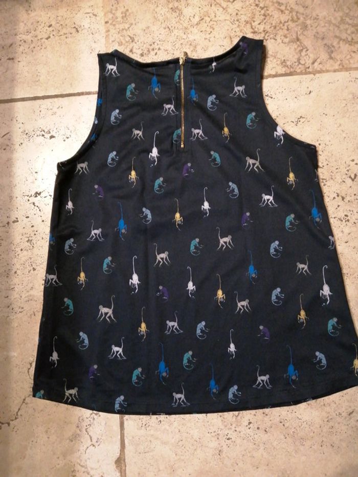 Débardeur léger avec motifs singes multicouleurs. Fermeture dans le dos étiquette de taille coupée