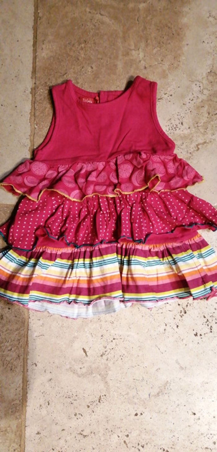 Robe multicolore sans manches à volants. Boutonnage dans le dos
