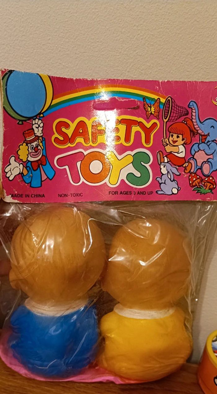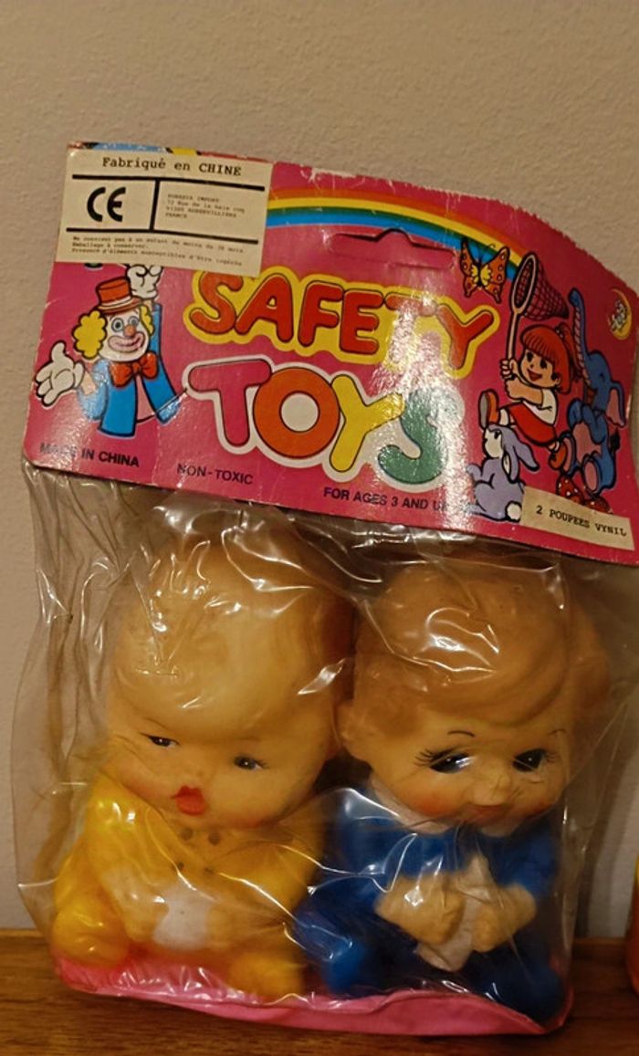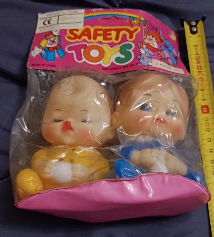 Figurine vinyle poupée vinyl lot de 2 bébés bleu jaune biberon Neuf dans emballage Pouet ok bruit Safety toys Jouet vintage, à jouer ou collectionner Collection jouet figurine articulée peluche poupee ancienne maison non fumeur et sans animaux n'hésitez pas à faire des lots