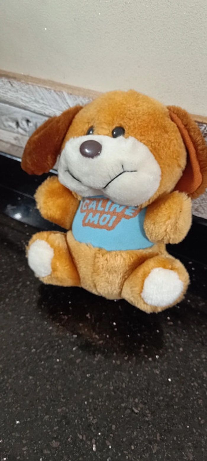 Peluche chien marki caline moi Beige marron bleu T shirt Jouet vintage, à jouer ou collectionner Collection jouet figurine articulée peluche poupee ancienne maison non fumeur et sans animaux n'hésitez pas à faire des lots