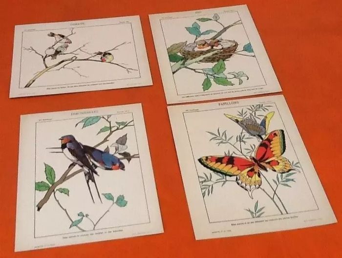 4 anciennes planches à dessin   Mes premiers pinceaux, Oiseaux, Papillons, Nid..