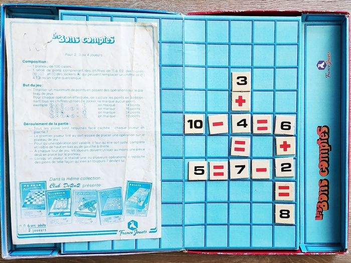 Jeu de société Les bons comptes But du jeu : totaliser un maximum de points en posant des opérations sur le plateau de jeux France jouets 2 joueurs A partir de 6 ans Notice inclue Jeu vintage des années 80