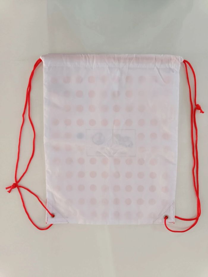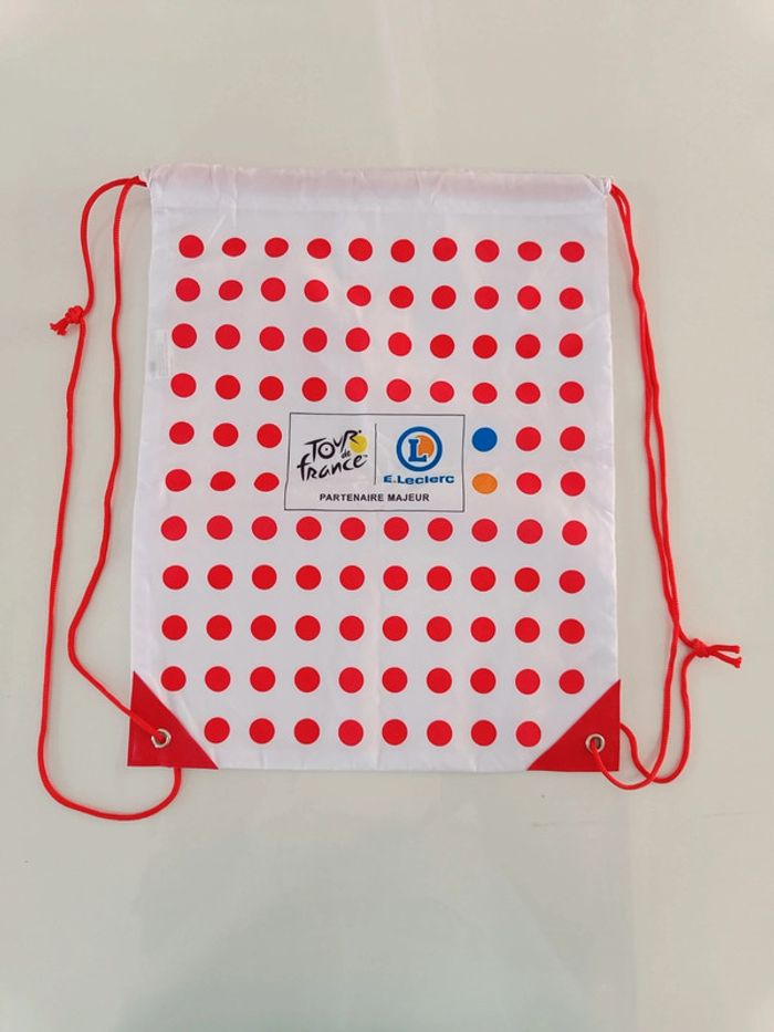 Sac plat à lanières. Goodies le tour de France. Dessin : pois rouge sur fond blanc. Inscription : tour de France. E.leclerc. partenaire majeur. Taille : 34 cm x 43 cm. #melody45340maison