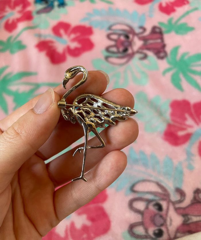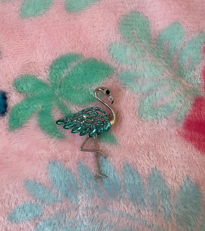 🌸 Magnifique broche flamant rose argentée et bleu turquoise en strass 🌸 Très bon état