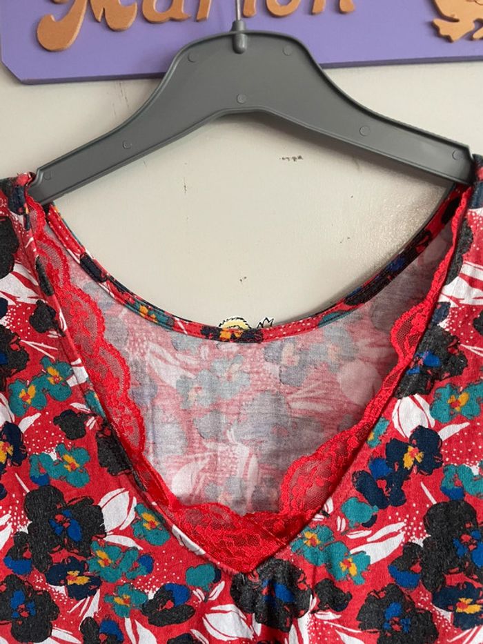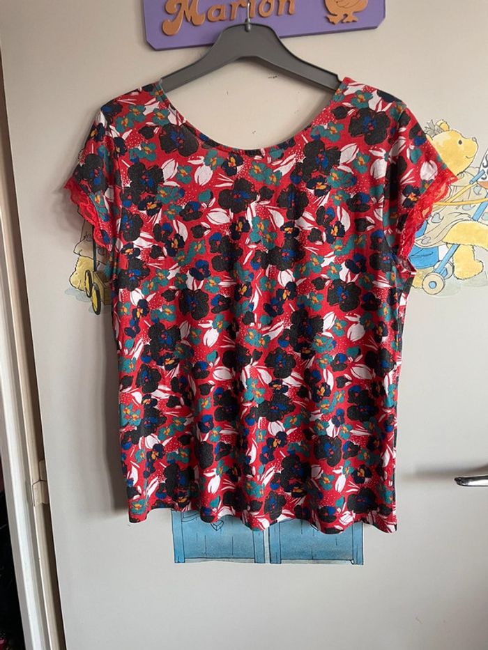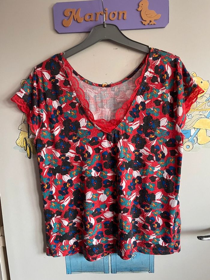 🌸 Tee shirt à manches courtes rouge à motifs avec joli détail dans le dos 🌸 Dentelle aux manches et dans le dos 🌸 Taille M 🌸 Marque Promod 🌸 Très bon état