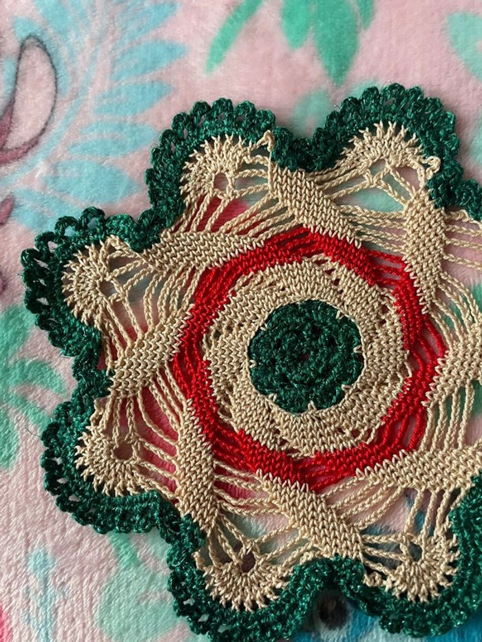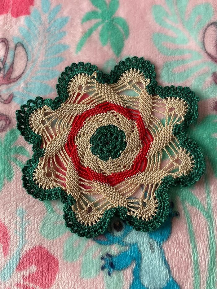 🌸 Napperon vert pailleté, rouge et beige 🌸 Fait à la main, très bon état