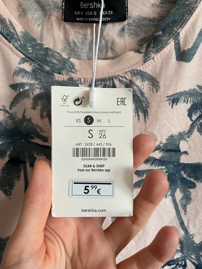 🌸 Tee shirt à manches courtes rose pâle à motifs palmiers 🌸 Taille S 🌸 Marque Bershka 🌸 Neuf avec étiquette