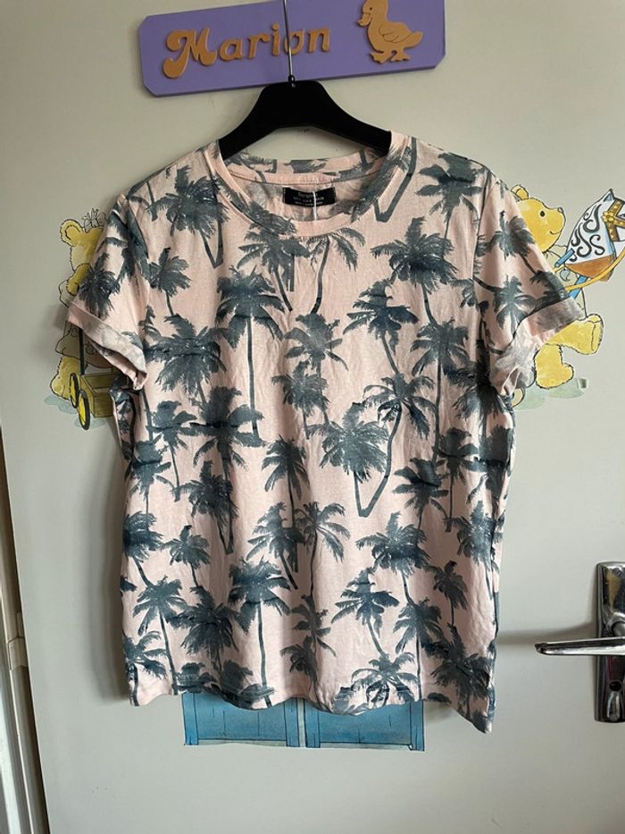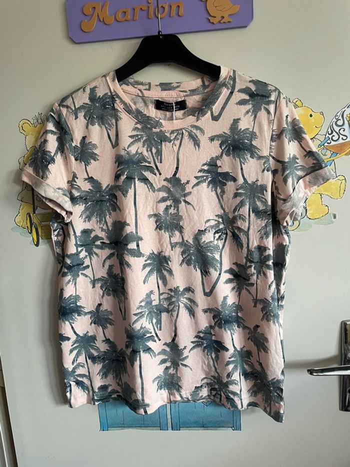Tee shirt à manches courtes rose pâle à motifs palmiers, taille S, marque Bershka - photo numéro 1