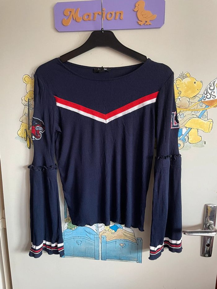 Tee shirt à manches longues évasées bleu marine à motifs, taille S, marque Jennyfer