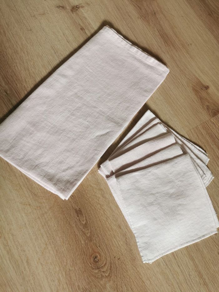 Napperon et serviettes de table rose à carreaux vintage. Le lot comprends un napperon réctangulaire ou chemin de table : 51x70 cm, et 6 serviettes de table : 32x33 cm, en bon état général, la couleur est dépassée, en coton à imprimé géométrique carré et rayures. Poids : 200g #textilevintage #textilecoton #napperonrose #napperonetserviettes #serviettesdetable #serviettesroses