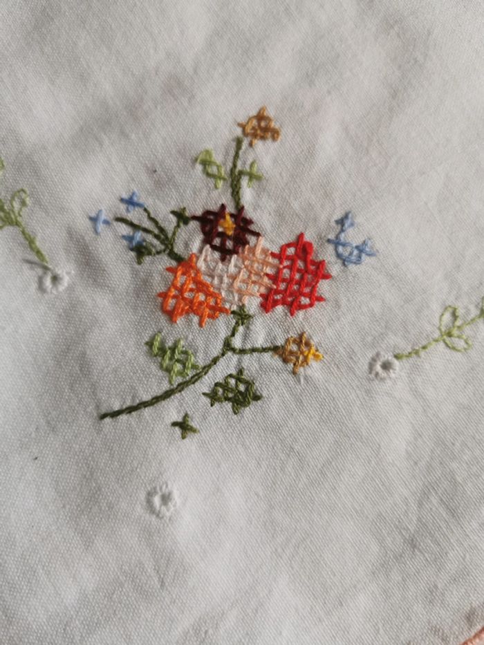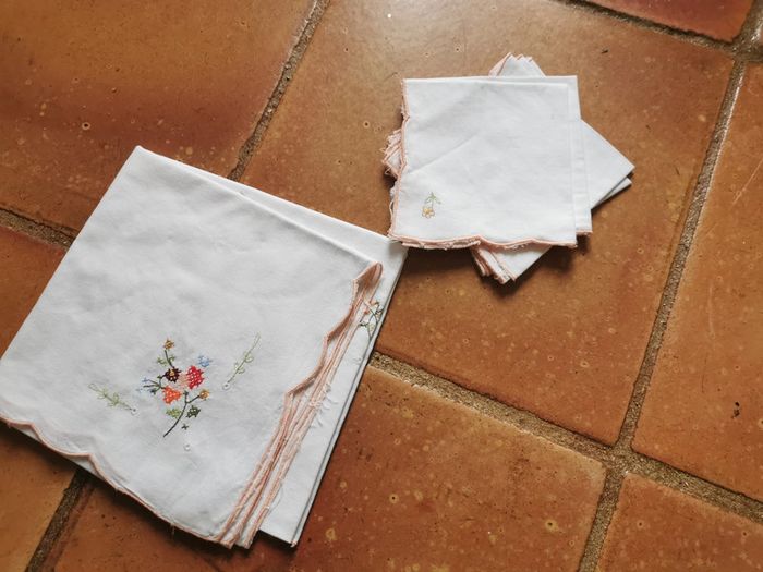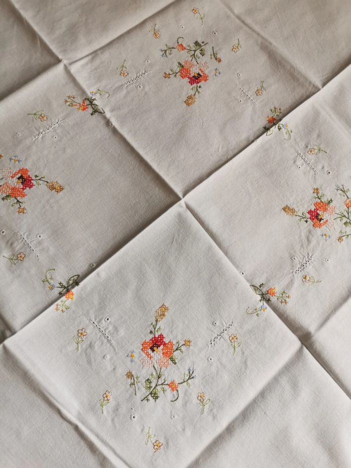 Nappe et serviettes ensemble en coton brodé Damart. Vintage, en bon état géénral, les bords sont effilochés, une petite fleur brodée dans le coin de chaque serviette qui fait 24x24 cm, en tout 4 serviettes dont deux ont deux micro taches, le napperon 84x81 cm, en très bon état, brodé, les bords sont légérement effilochés. Poids 200g #napperons #serviettesencoton #serviettesbrodees #napperonbrode #damart