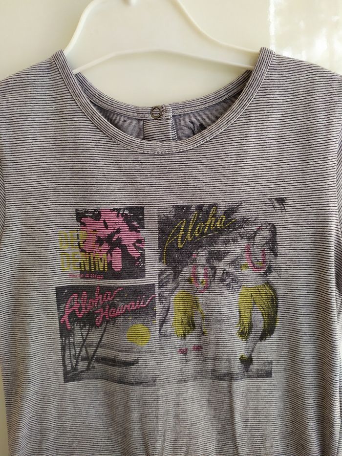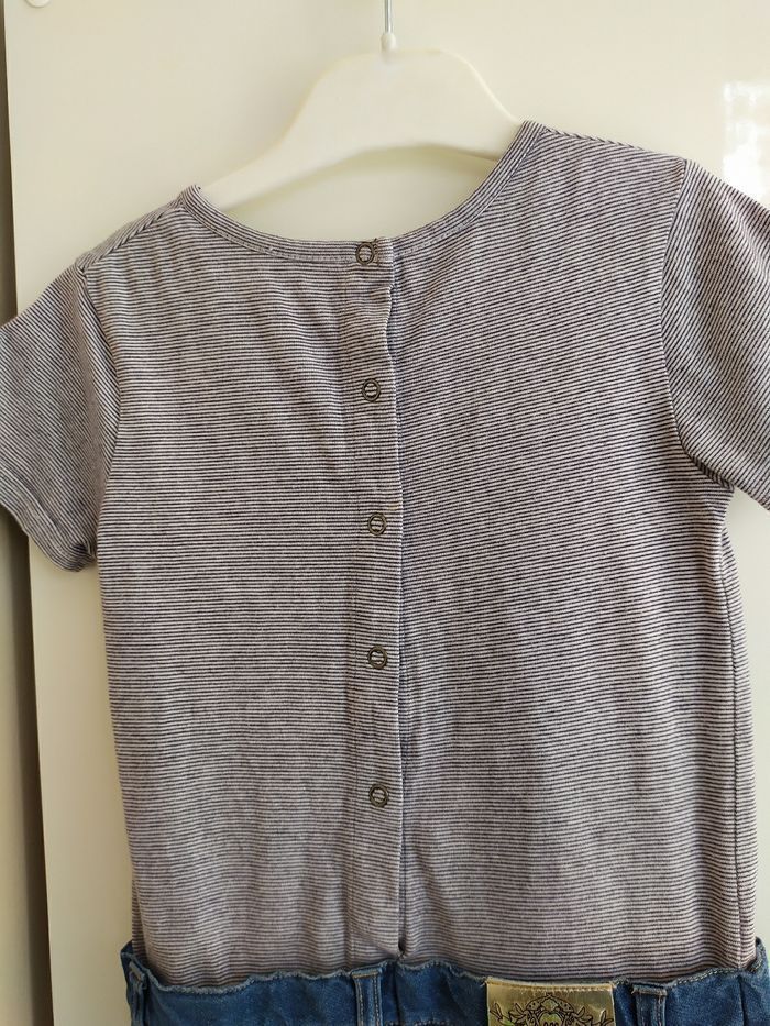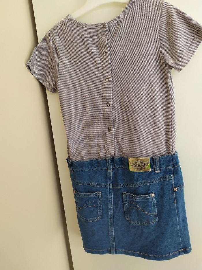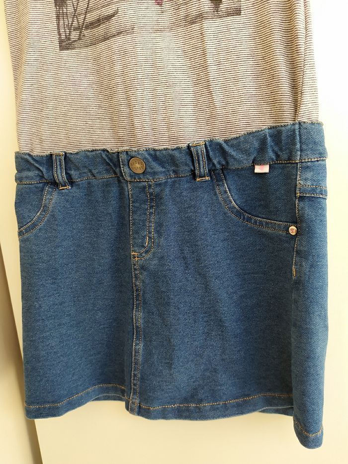 Jolie robe effet t.shirt+jupe en jean. Ouverture dans le dos par boutons pression. Jupe en jean, deux fausses poches devant. Deux poches dans le dos. Composition haut :100% coton Composition jupe : 95% coton, 5% elasthanne. Longueur totale : 60 cm Robe en EXELLENT ÉTAT Réductions sur lot activitées. 🚭Maison non fumeur #nerimafille6ans