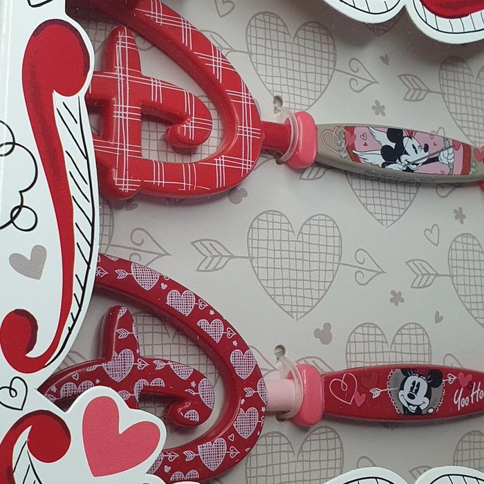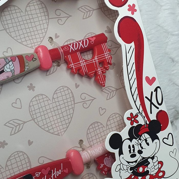 Disney Duo de clés romantiques Mickey et Minnie Nouvelle Collection saint valentin chateau couple disneyland Clé Mickey avec motif écossais et inscription « XOXO » (Gros bisous) Clé Minnie avec petits coeurs et inscriptions « Yoo Hoo! » (Ohé !) et « Thinking of you » (Je pense à toi) Produit créé pour Disney Store