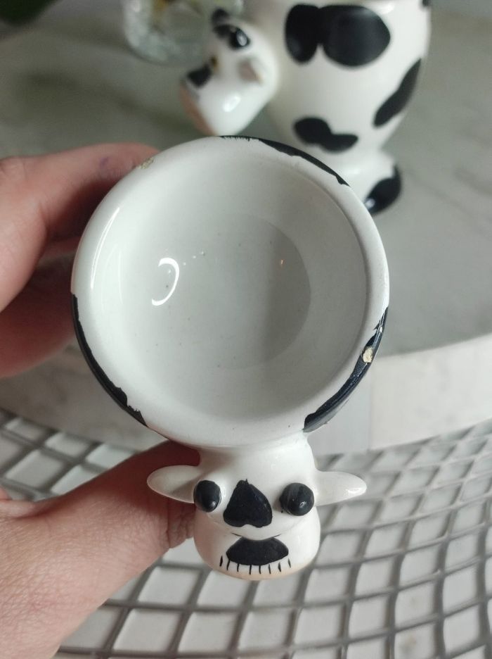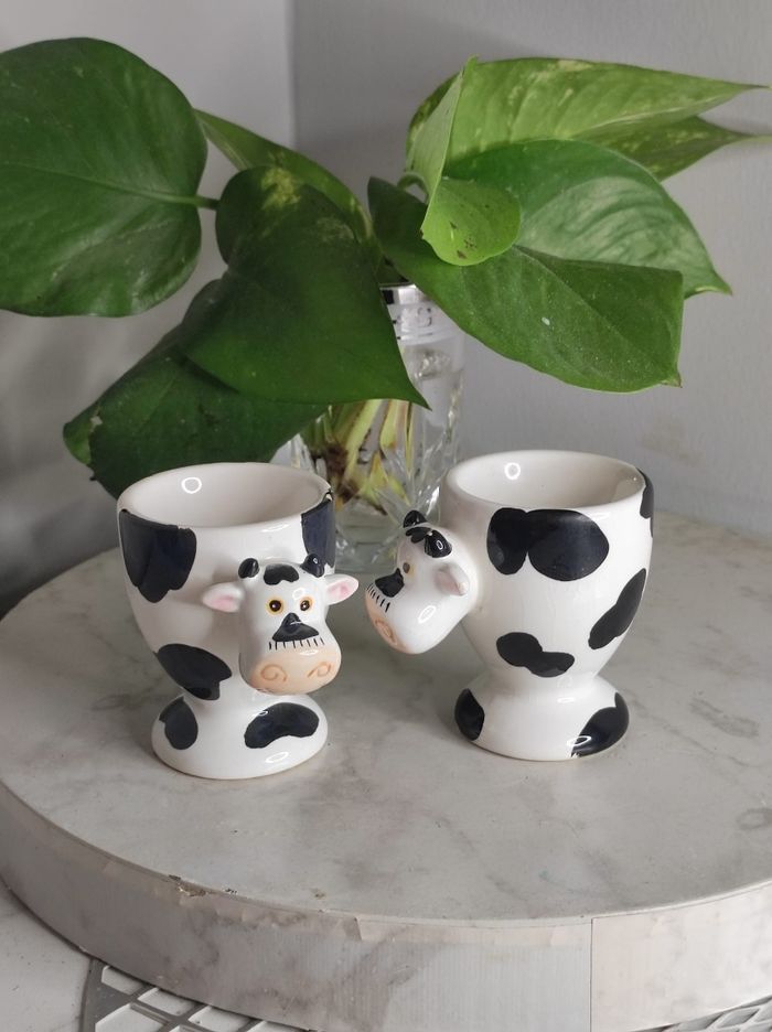 Duo de coquetiers vache. Une des deux à de touts petits éclats ( cf photo ). Léger et fragile.