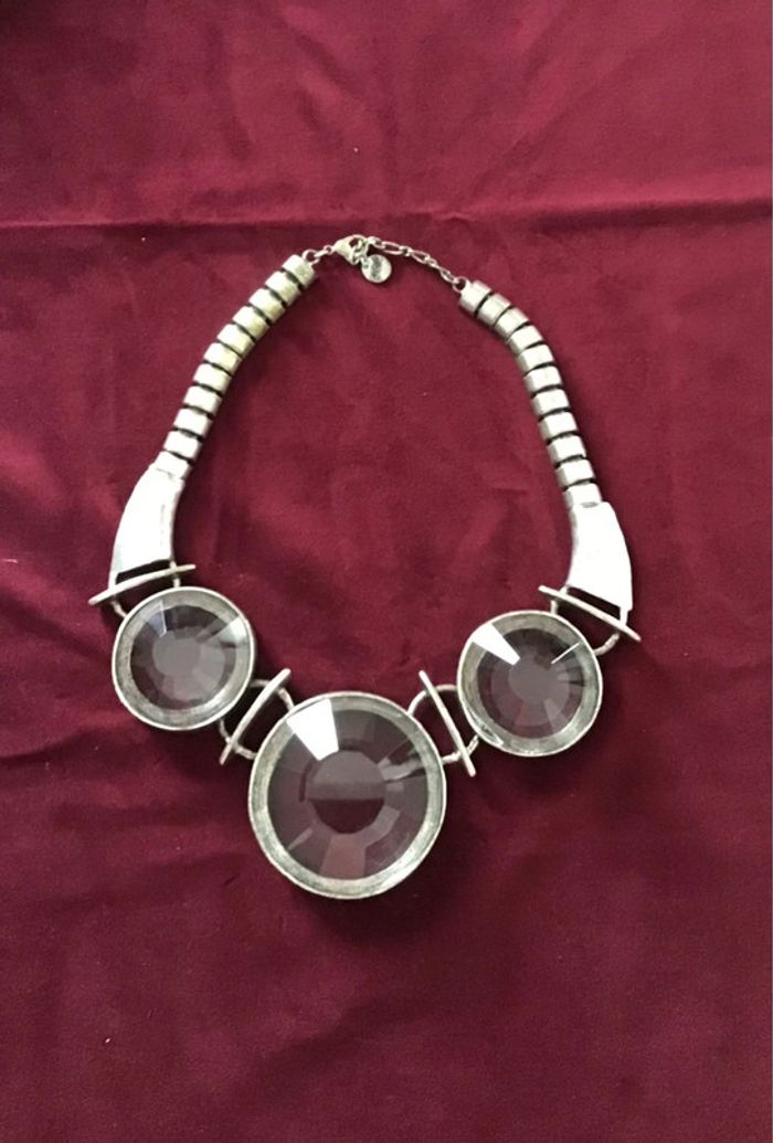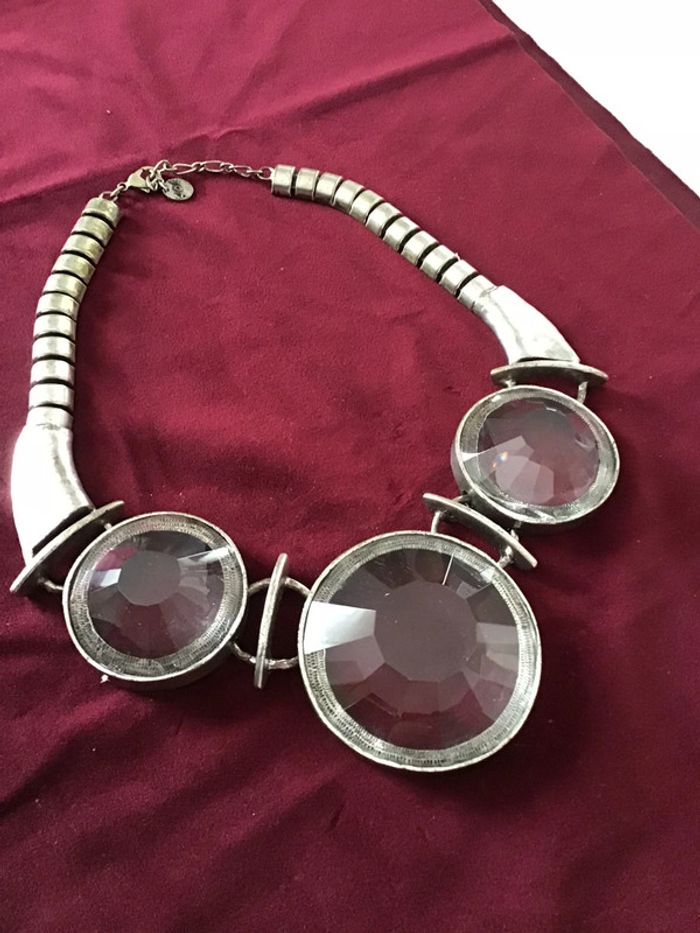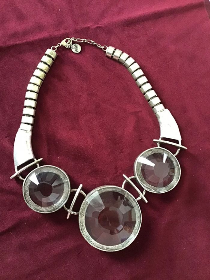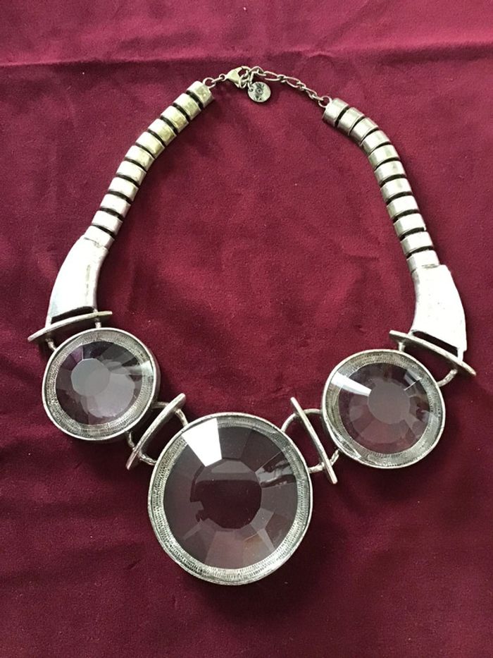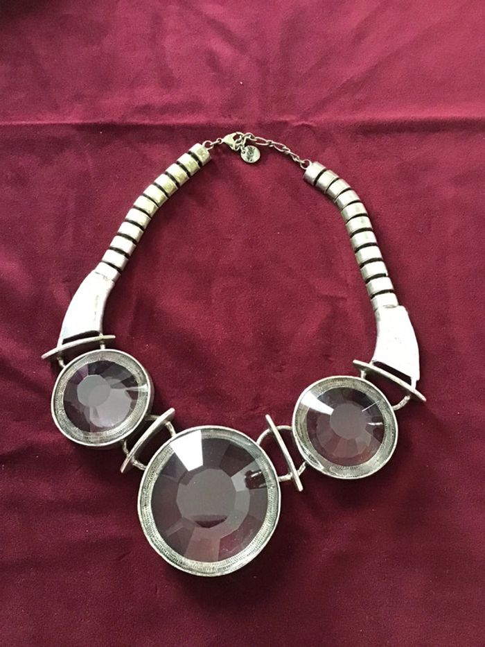 Métal argenté et verroterie taillée. Poids 360 g environ. Beaux détails et magnifique rendu