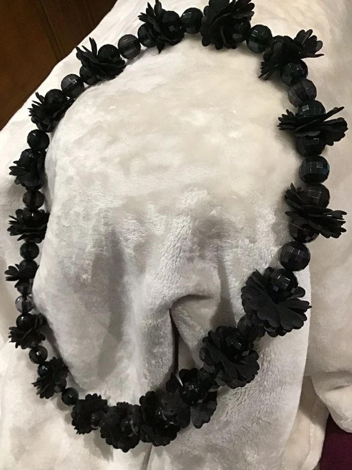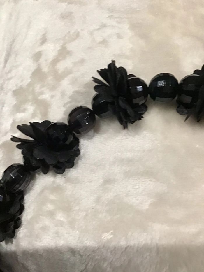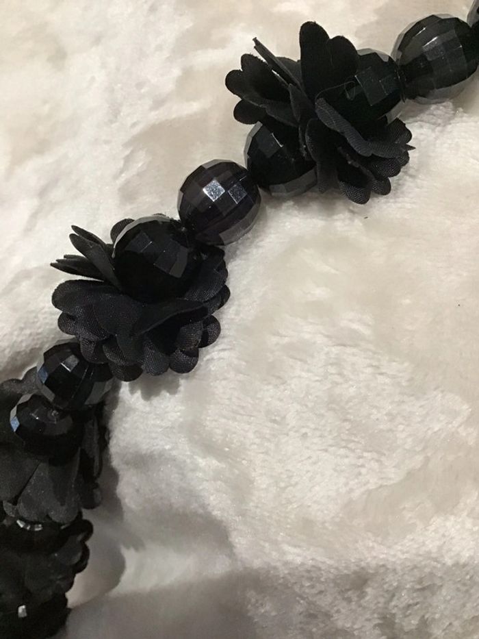 Années 90 Assemblage de perles facettes ornées de fleurs noires tissu. Beau rendu