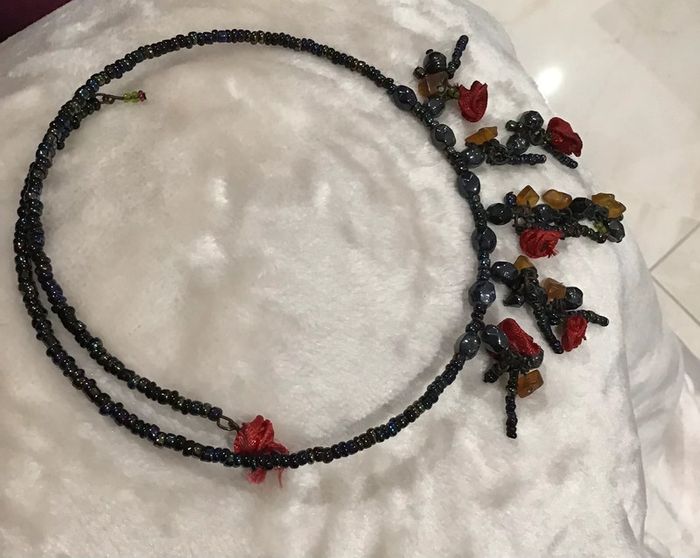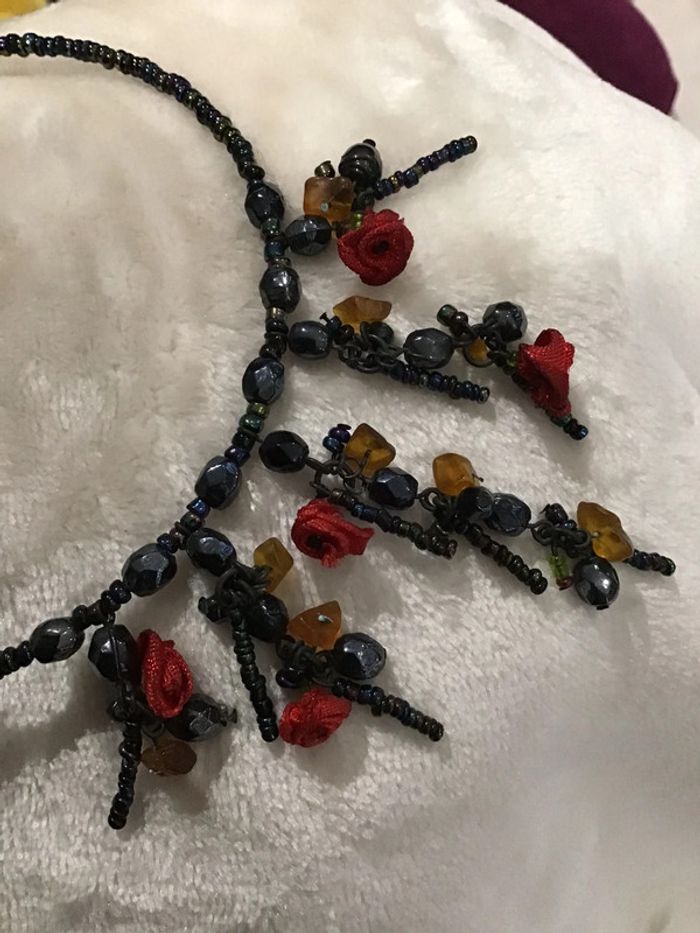 Ras le cou extensible Convient à tous les cous. Assemblage de petites perles noires et ambres avec mini roses tissu. Magnifique rendu