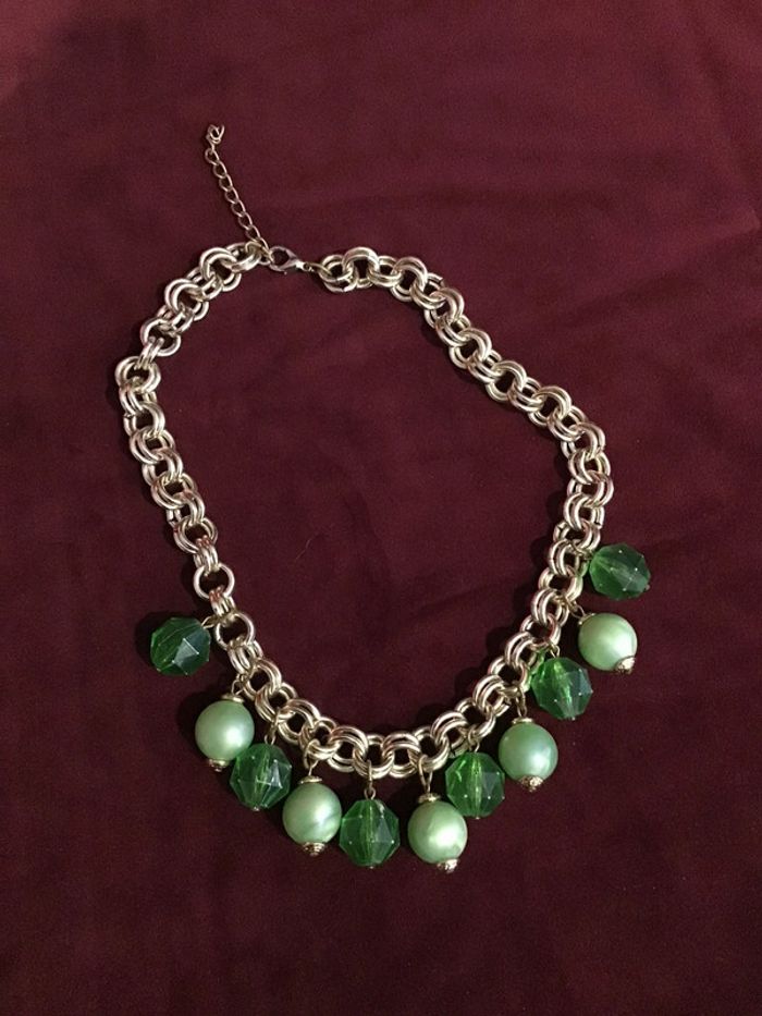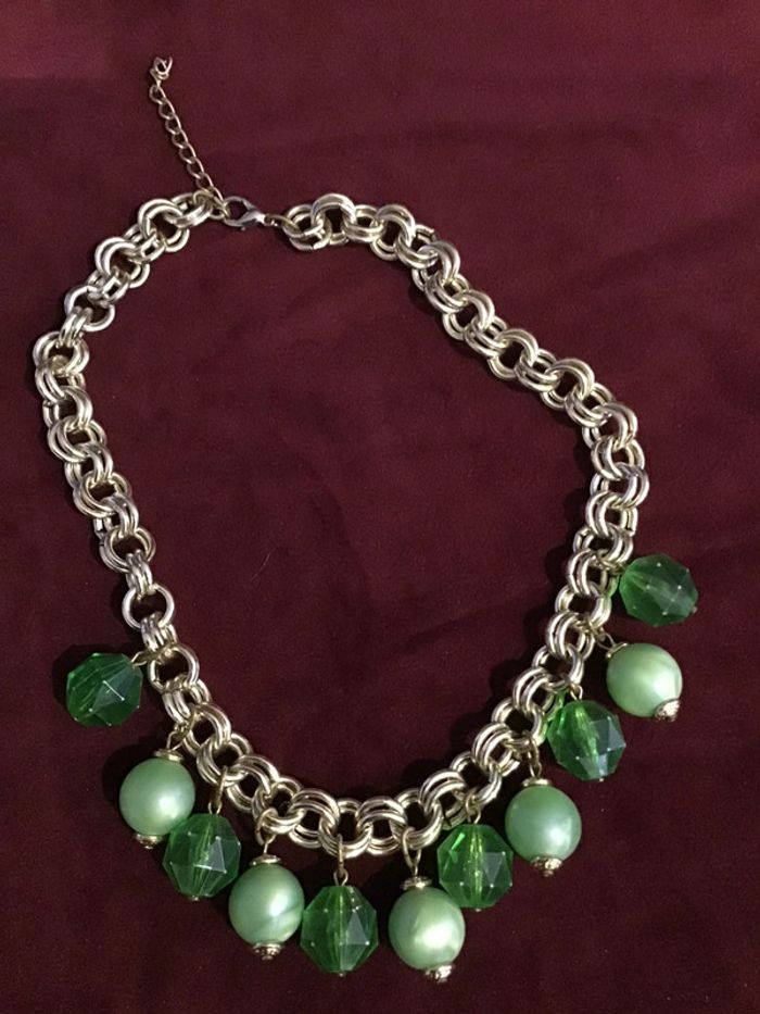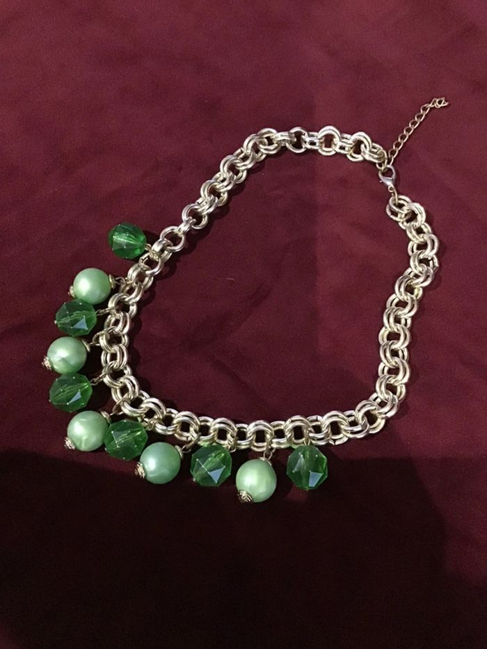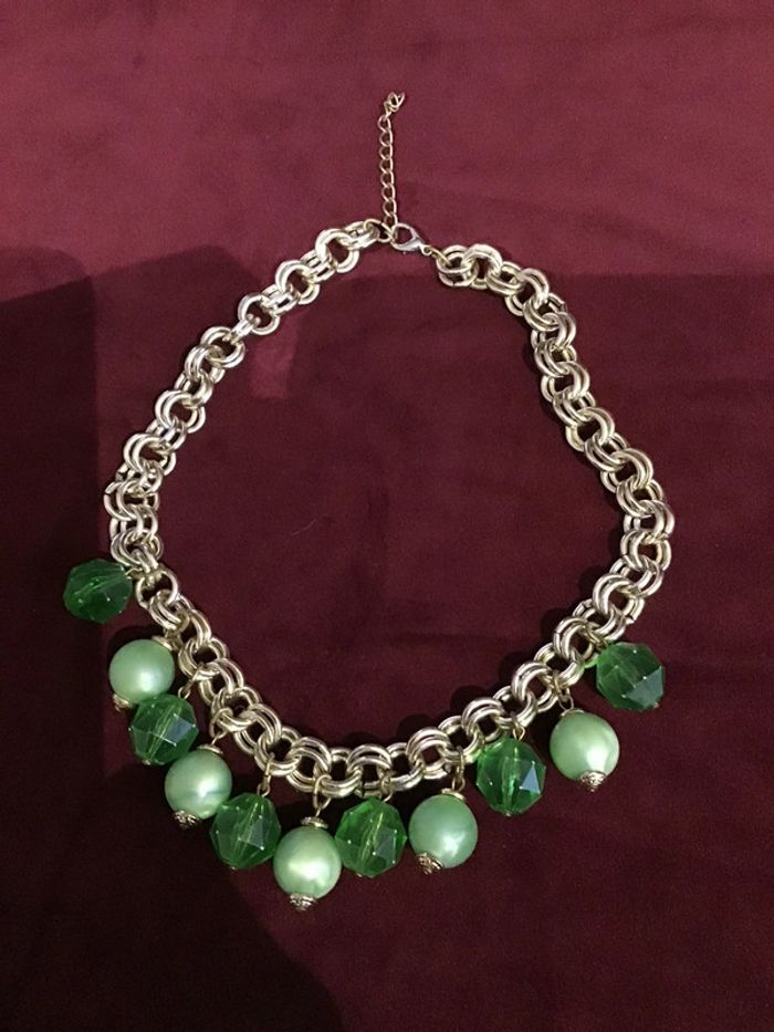 Années 90 Collier doré double maille souple et léger Orné de perles perles vertes nacrées et taillées Superbe rendu