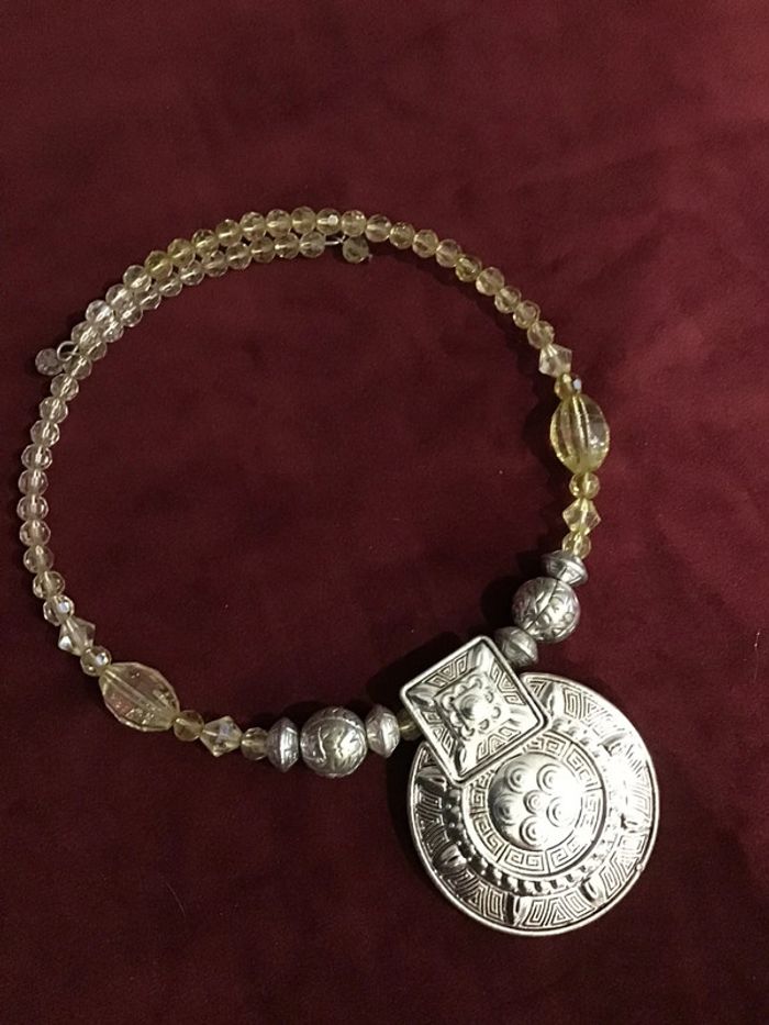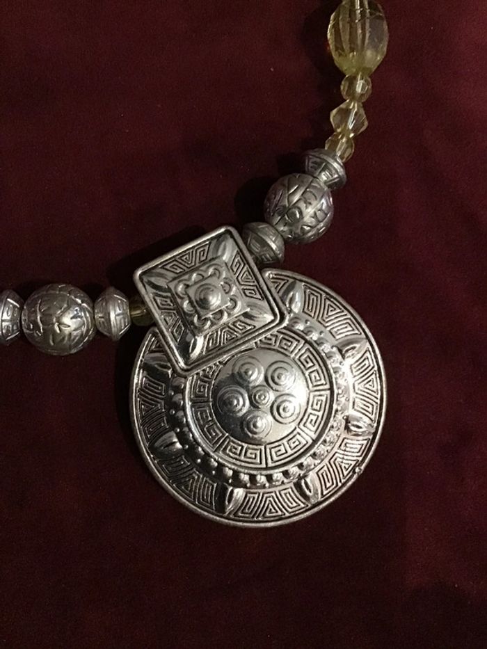 Collier extensible. Convient à tous les cous. Assemblage de perles facettées translucides et argentées Important Pendentif motif ancien ouvragé argenté Superbe rendu