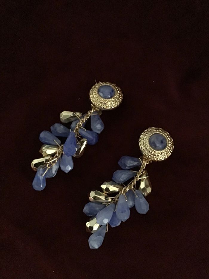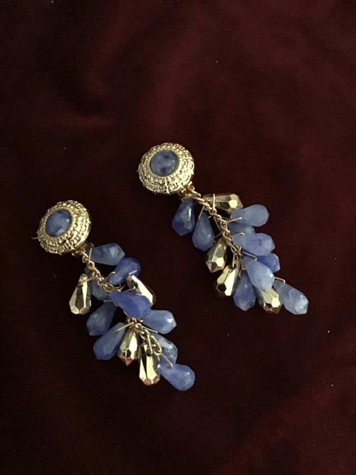 Très beaux clips grappes bleues sur belle monture dorée avec pendants perles taillées bleues et dorées Magnifique rendu