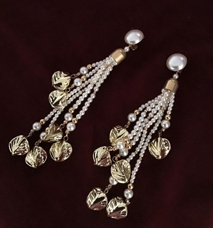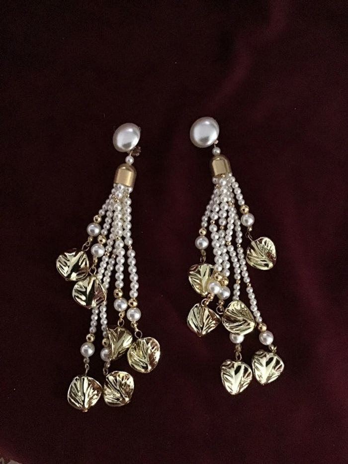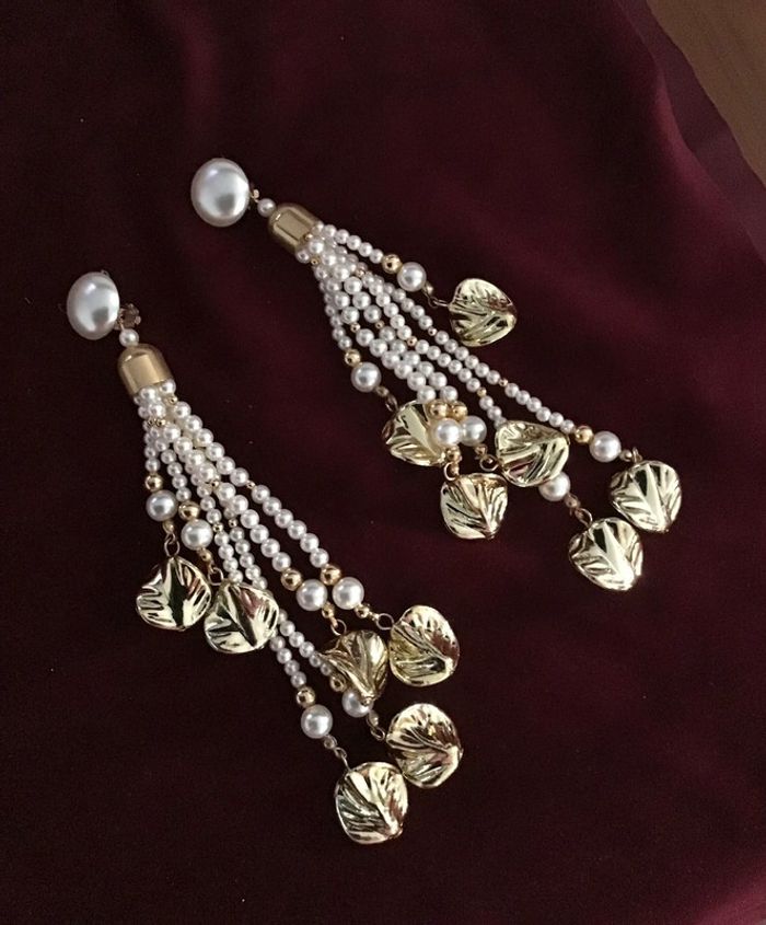 Longs pendants perles multiples et petites feuilles dorées Sublime rendu