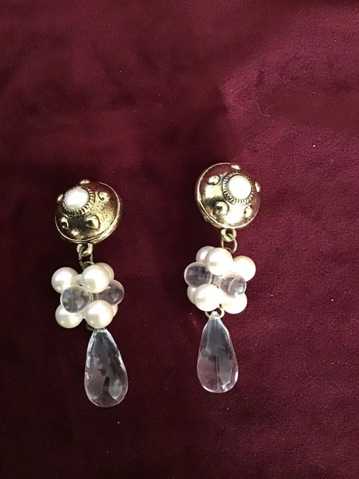 Années 80 Pendants clips fleurs perles monture bronze ornée de gouttes d’eau Très beau rendu