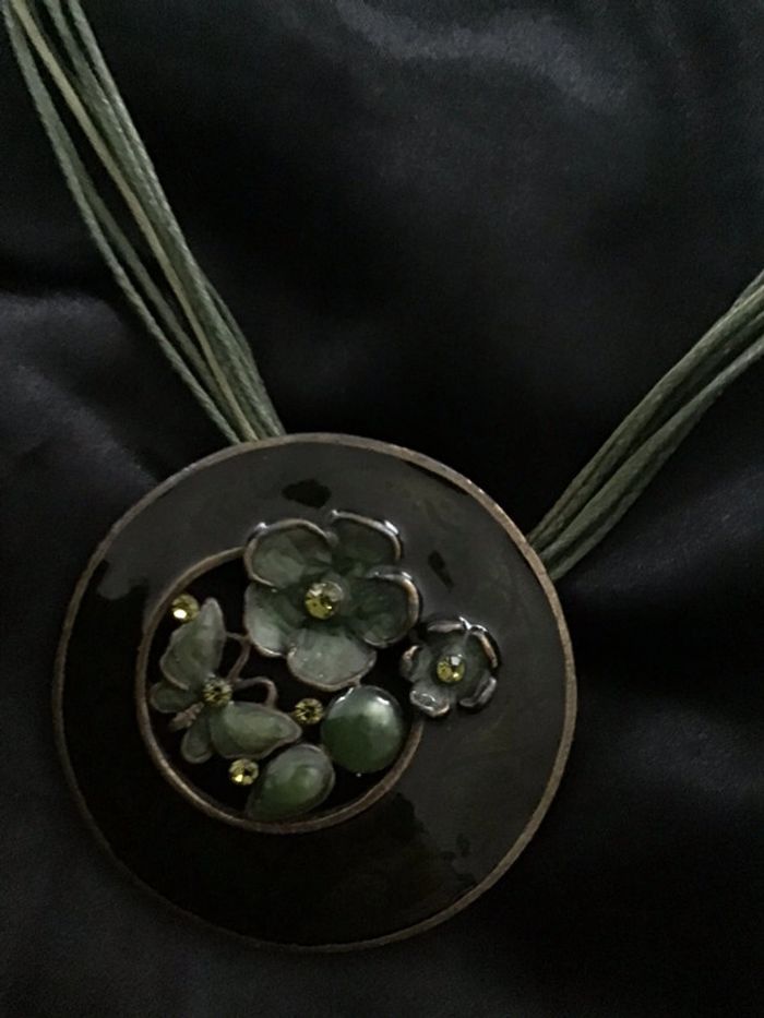Années 90 Beau médaillon façon émaux à motifs floraux et papillon en incrustation