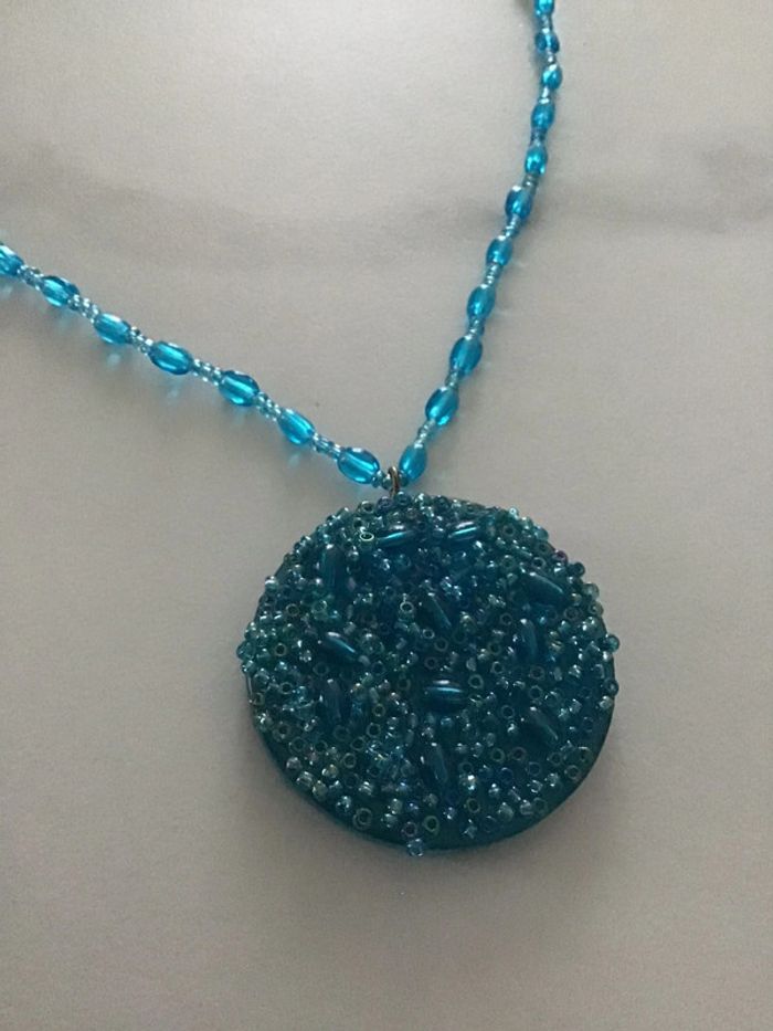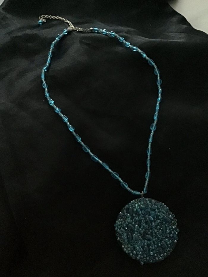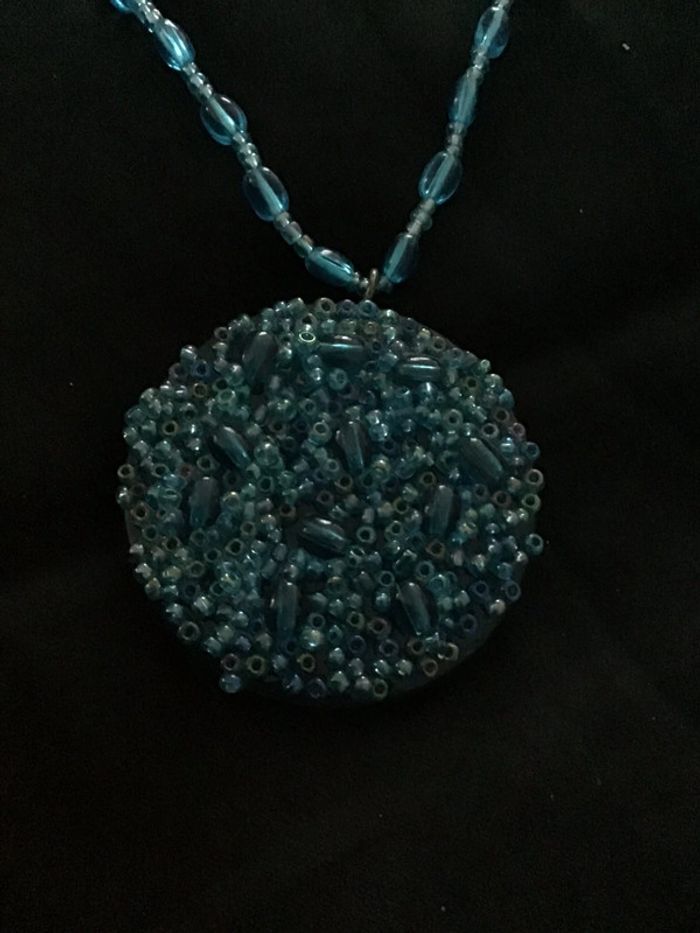 Années 90 Petites perles bleues séparées par mini perles ornées d’un médaillon constitué d’un assemblage harmonieux de perles du même ton Charmant rendu