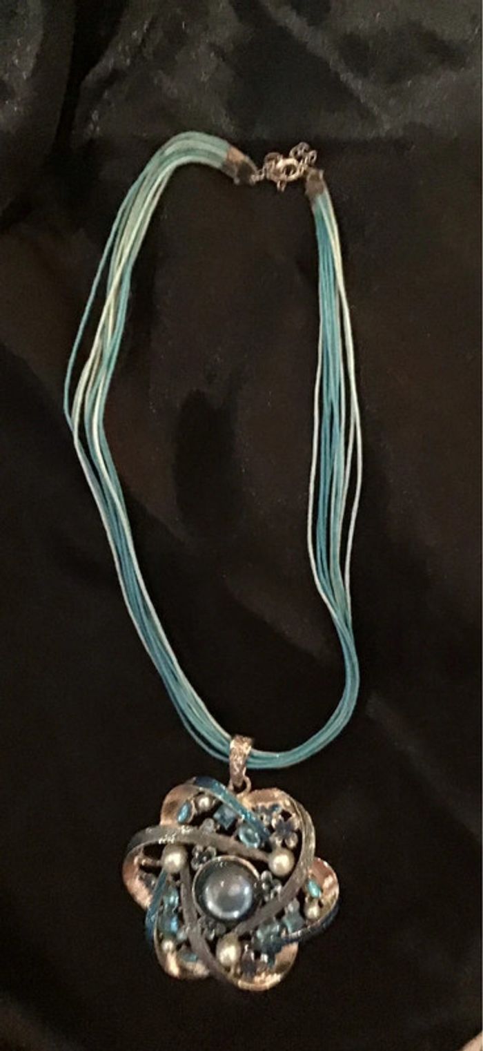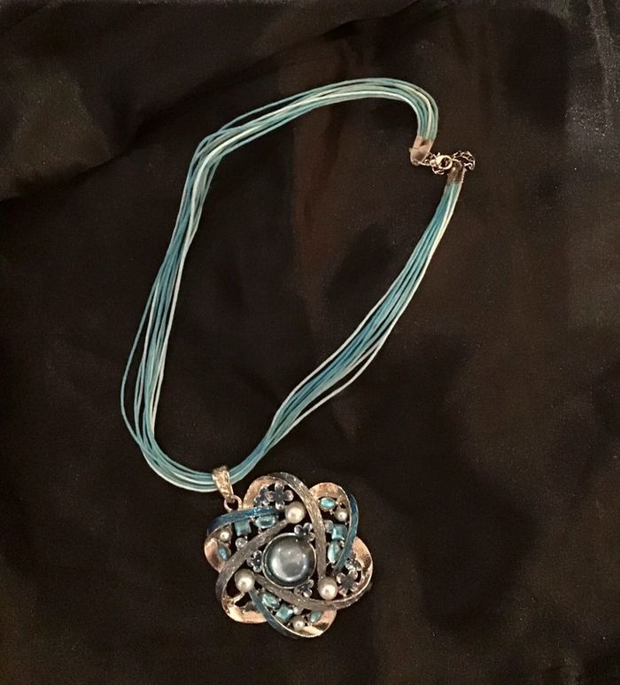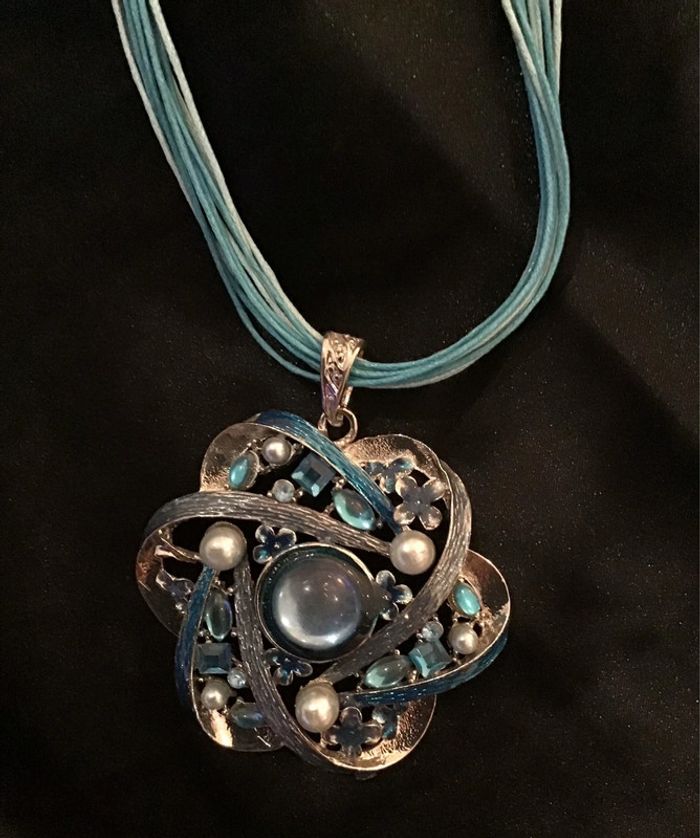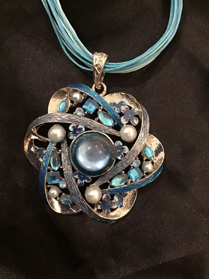 Années 90 Beau médaillon fleur orné de perles façon culture Et pierres bleues