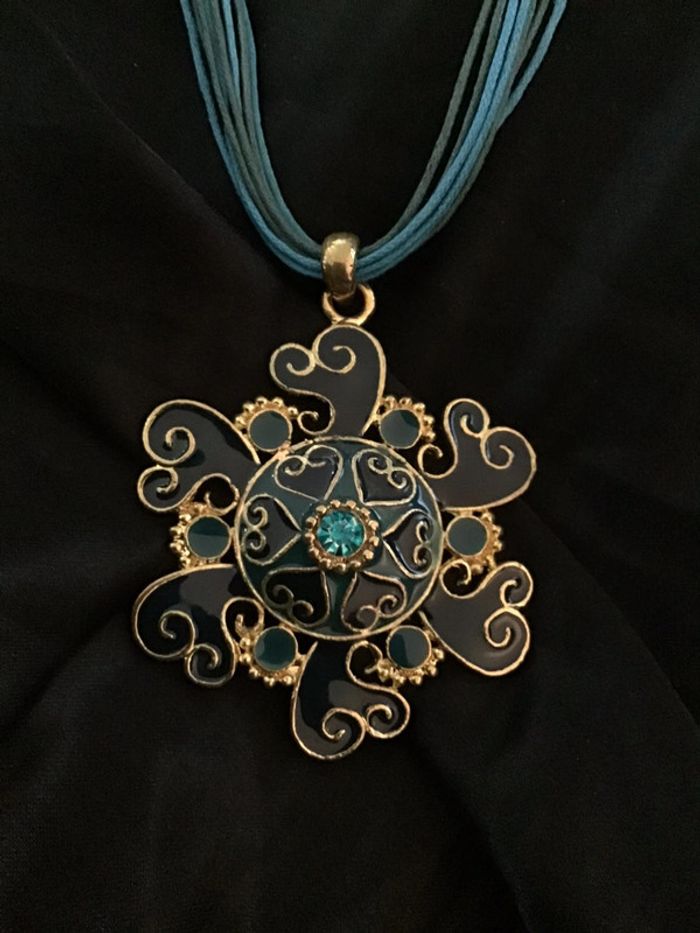 Années 90 Médaillon fleur style émaux bleus avec petite pierre centrale