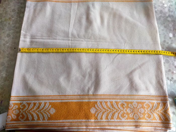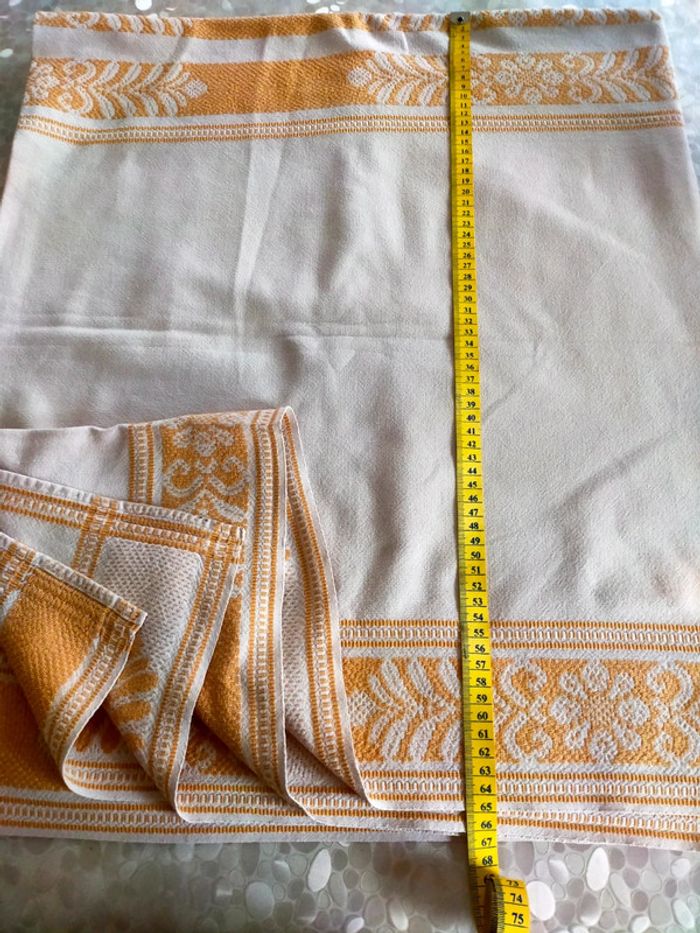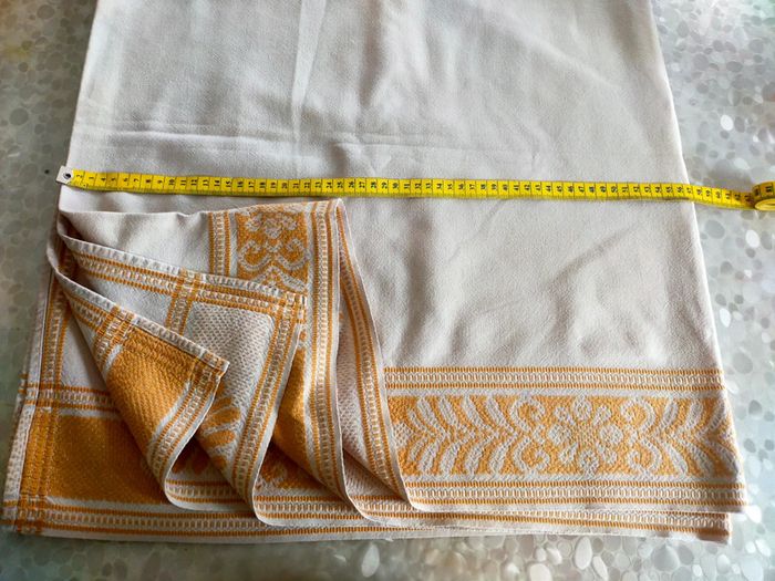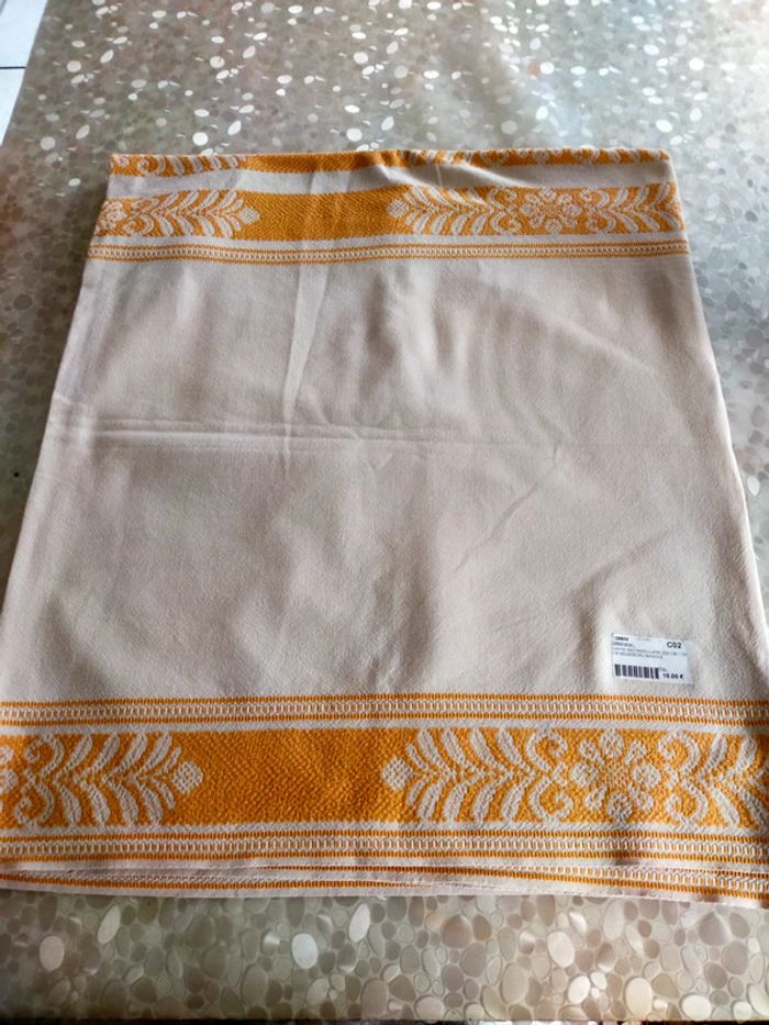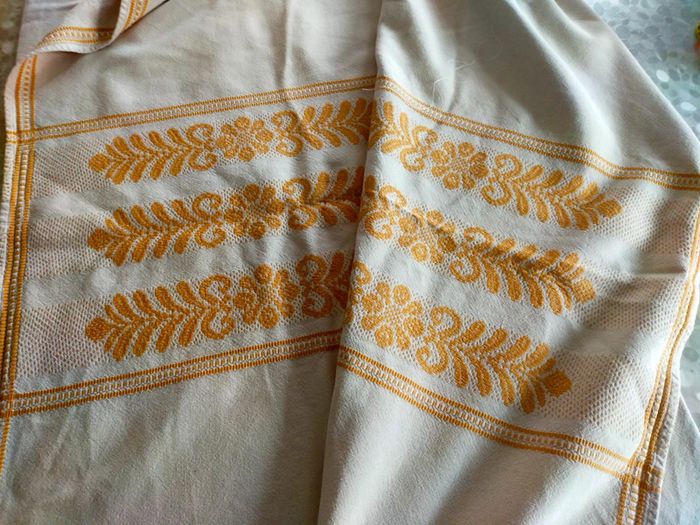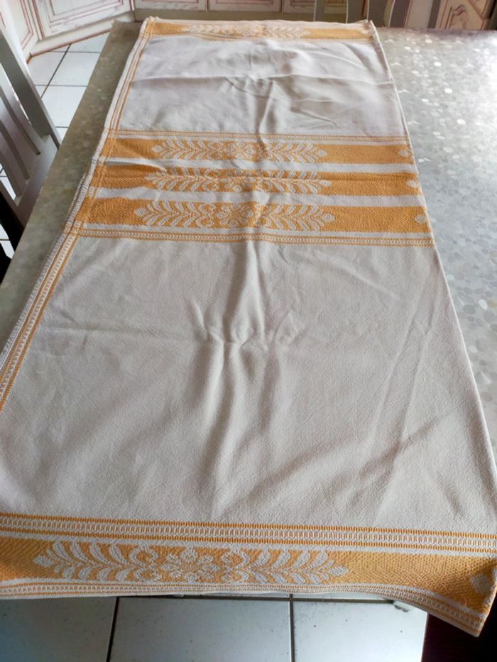 Nappe rectangulaire blanc casse avec des broderies ocre . Dimensions 130 cm sur 280 cm . Excellente état libre de suite envoi possible à vos frais.