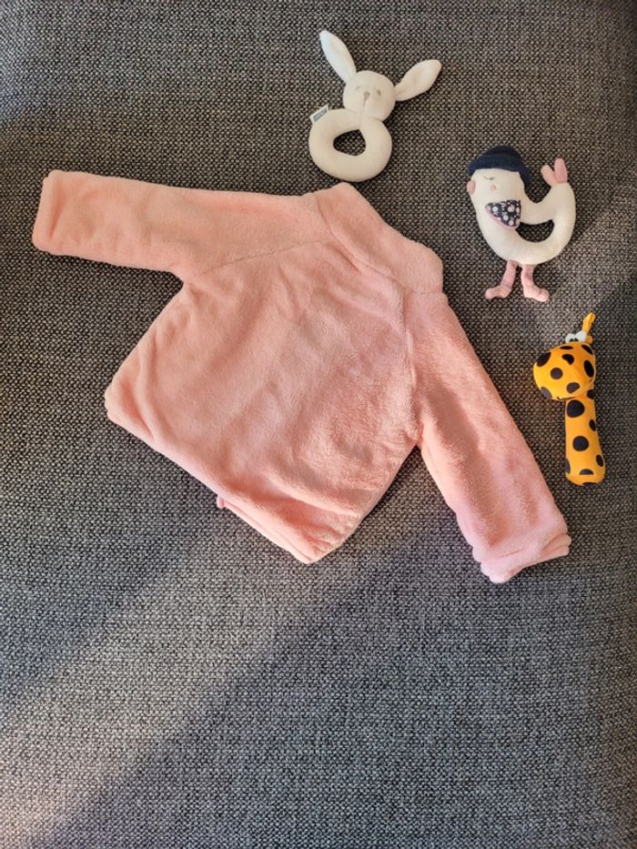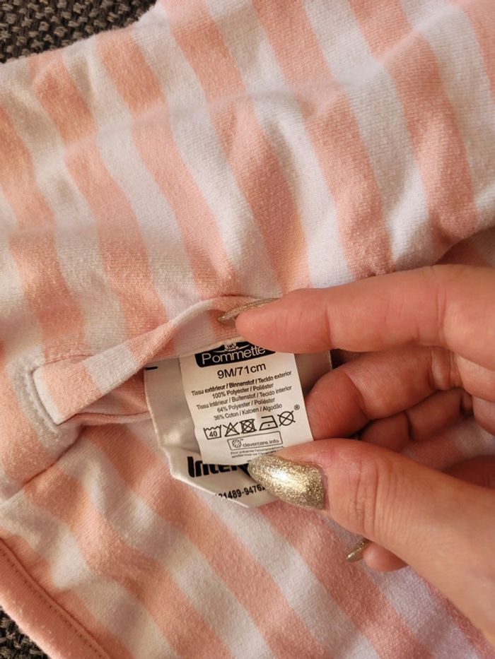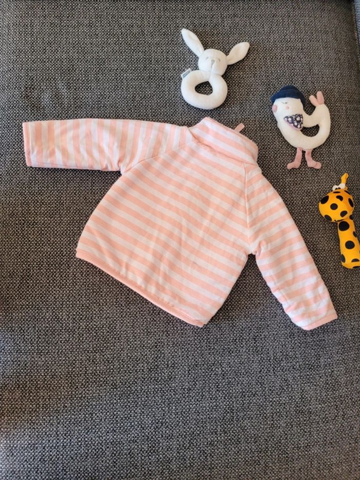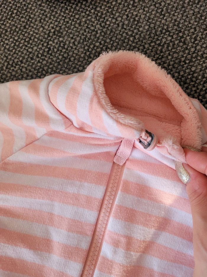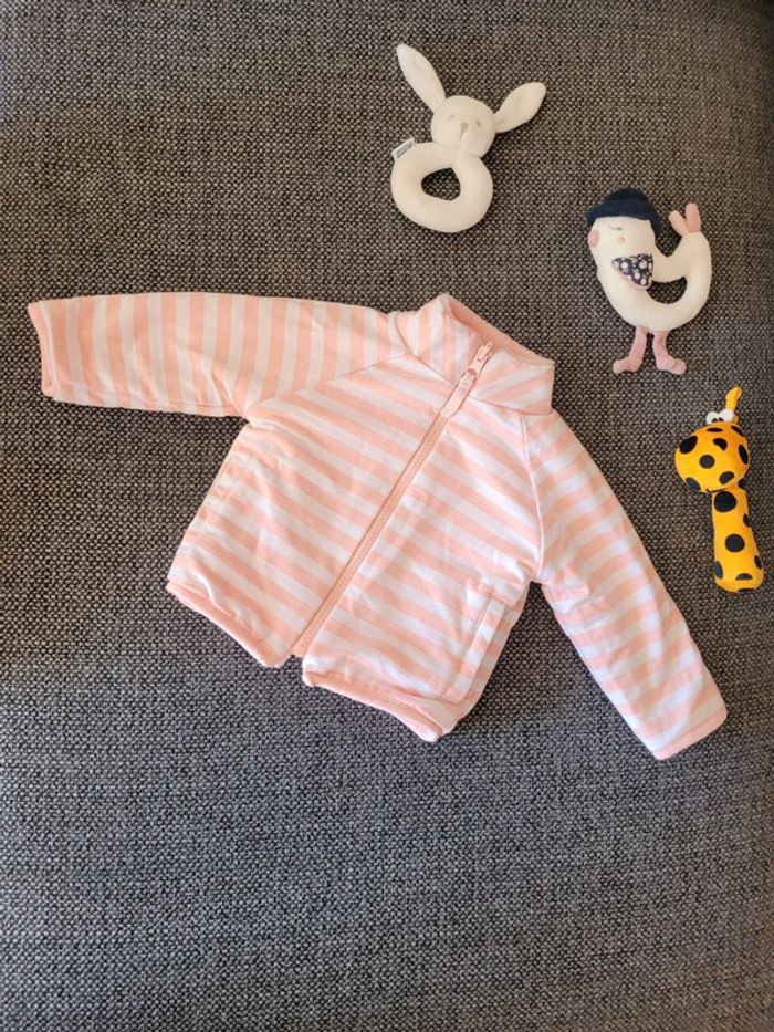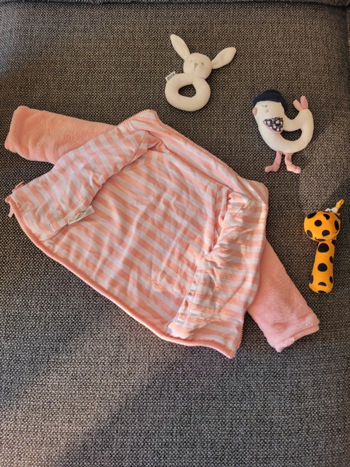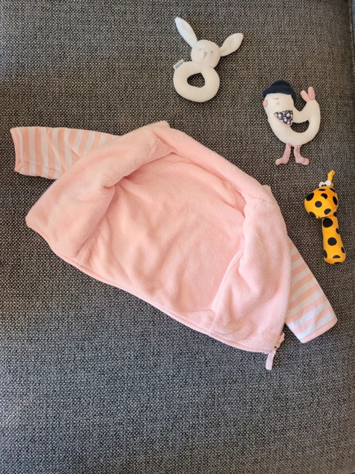 Veste réversible pour fille de taille 9 mois de marque Pommette Un côté rose clair uni en pilou-pilou et un côté à grosses rayures blanches et roses claires avec 2 poches Veste épaisse bien chaude pour l'hiver Fermeture éclair qui a perdu un peu de sa couleur (voir avant dernière photo) Aucun trou. Une trace de feutre côté rayé dans le dos (voir dernière photo) #mabi38780fille9mois