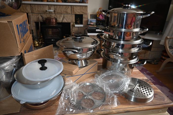 7 casseroles AMC 5 neuves, 1 utilisée une fois pour faire bouillir de l'eau, une utilisée très légèrement. Sur les 7 casseroles, 2 sont toujours dans la boîte d'origine. Elles sont stockées depuis 1981.Ce sont des achats uniques. J'utilise des casseroles AMC depuis 1980 et elles ont toujours l'air incroyables. Ce sont les casseroles originales les plus lourdes. Pas celles légères qui sont arrivées plus tard. Comprend : 1 soupière avec couvercle Bol à mélanger 2 saladiers 1 râpe 3 bols de service Pochette à œufs Plateau à vapeur Ces casseroles et accessoires AMC sont en ma possession depuis 1981 et deux des casseroles sont toujours dans les boîtes AMC d'origine.